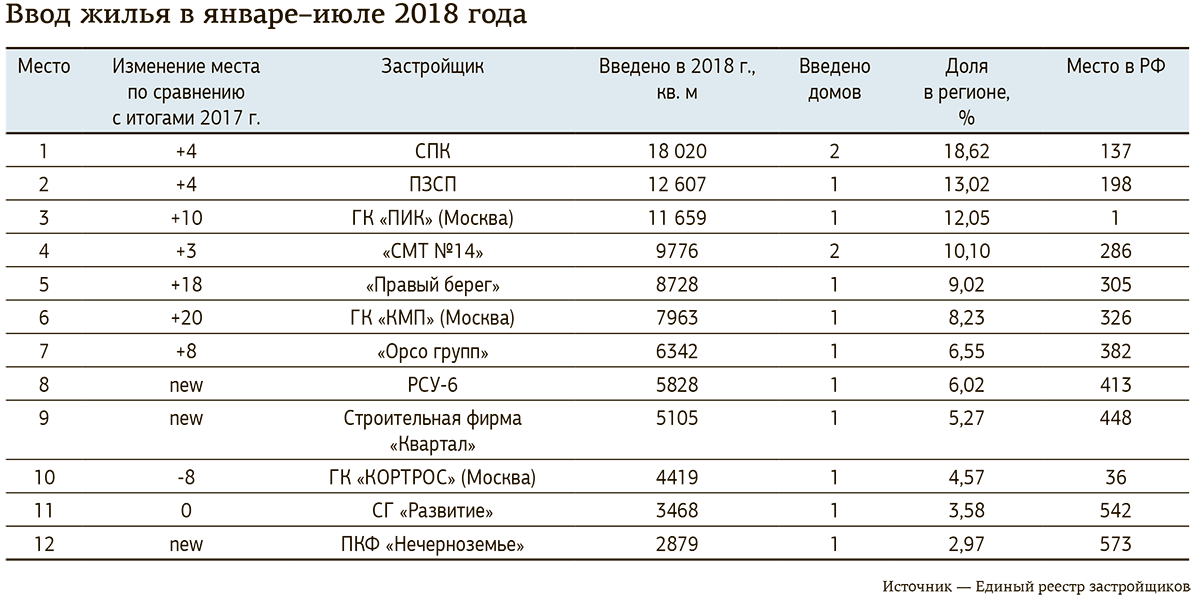 Региональный рынок строительства остаётся высококонцентрированным. На долю 10 крупнейших застройщиков приходится 63% строительства (по объёму площадей), на долю 20 крупнейших — 83%. Однако если несколько лет назад в топ-10 фигурировали преимущественно местные компании, то сегодня в нём прочно обосновались несколько предприятий, «прописанных» в других регионах. В 2016—2017 годах доля иногородних застройщиков по объёмам введённого жилья колебалась в пределах 20%, по итогам семи месяцев 2018-го — увеличилась до 25%. Эксперты считают, что они, в отличие от местных строителей, попали в спрос.