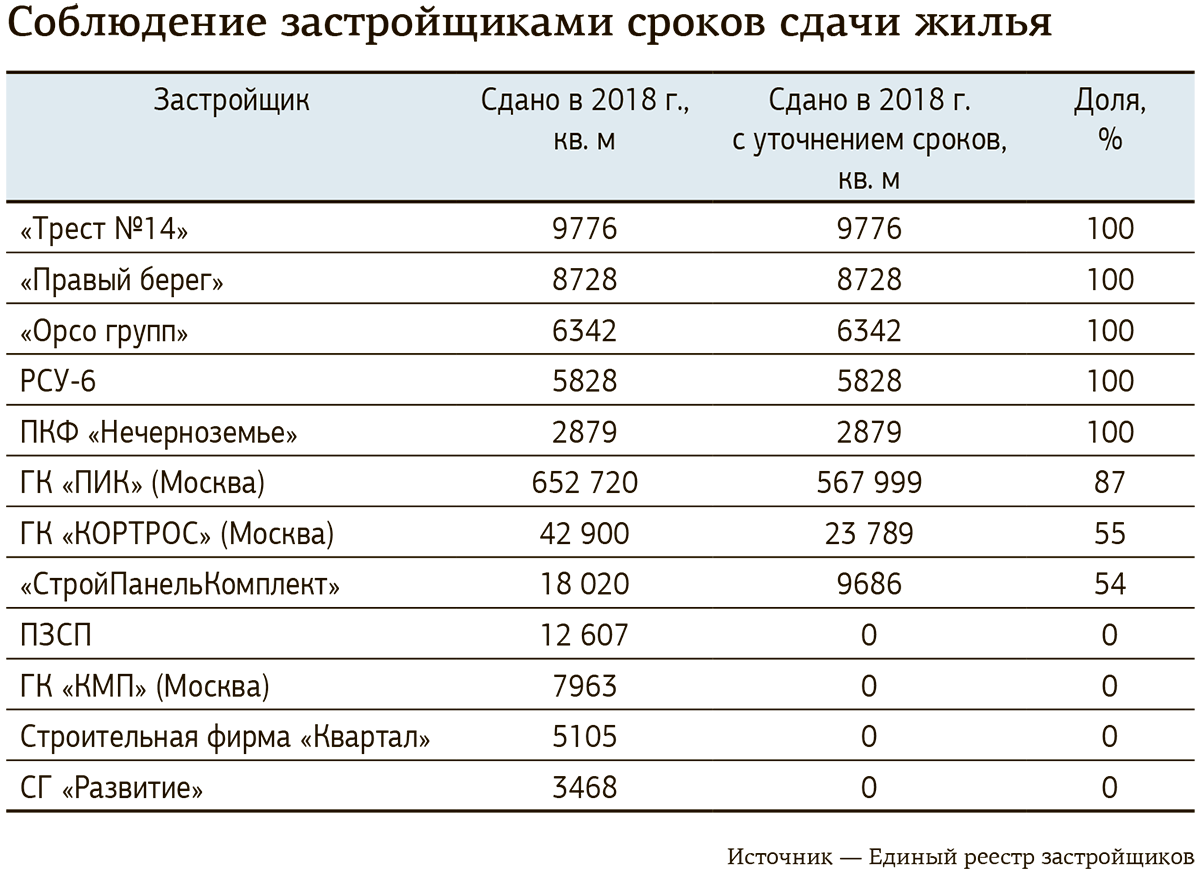 Одной из причин смены лидеров стала финансовая ситуация у тех застройщиков, которые давно работают на рынке. По этой же причине часто сдвигаются сроки сдачи домов. Например, по данным Единого реестра застройщиков, половина жилья, построенного в 2018 году «СтройПанельКомплектом», введена на 16 месяцев позже, чем планировалось.