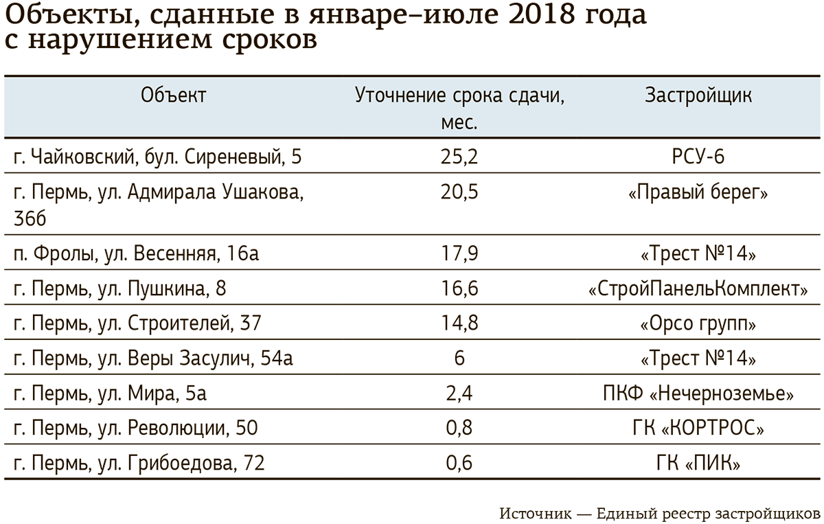 Вместе с тем, по данным Пермьстата, объём ввода многоквартирных домов за первые семь месяцев текущего года в Пермском крае составил 166,3 тыс. кв. м, и это на 12% больше, чем за аналогичный период прошлого года. В отчётах Единого реестра застройщиков при этом фигурируют другие цифры: в январе—июле 2018 года было введено 96,8 тыс. кв. м жилья. При этом итог 2017 года был равен 470,7 тыс. кв. м, а 2016-го — 595,7 тыс. кв. м.