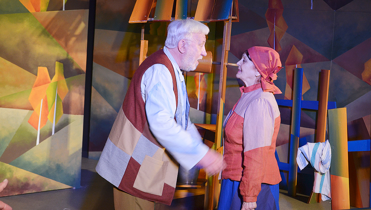Есть вопросы и к сценографии, и они тоже связаны с избранным постановщиком камерным жанром. Новый главный художник ТЮЗа Алёна Исакова выбрала стилистику русского авангарда: и декорации, и реквизит, и даже костюмы сделаны «по-лентуловски» — из угловатых разноцветных лоскутков. Декорация очень симпатичная: простой и в то же время радостный деревенский пейзаж с маленькой беленькой церковкой и очаровательной козой на привязи. Но реквизит — такой же разноцветный, угловатый и сияющий свежей глянцевой краской — в камерном спектакле выглядит неуместно театральным, рождая ощущение тотального «мультика».