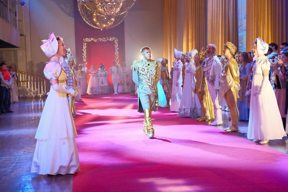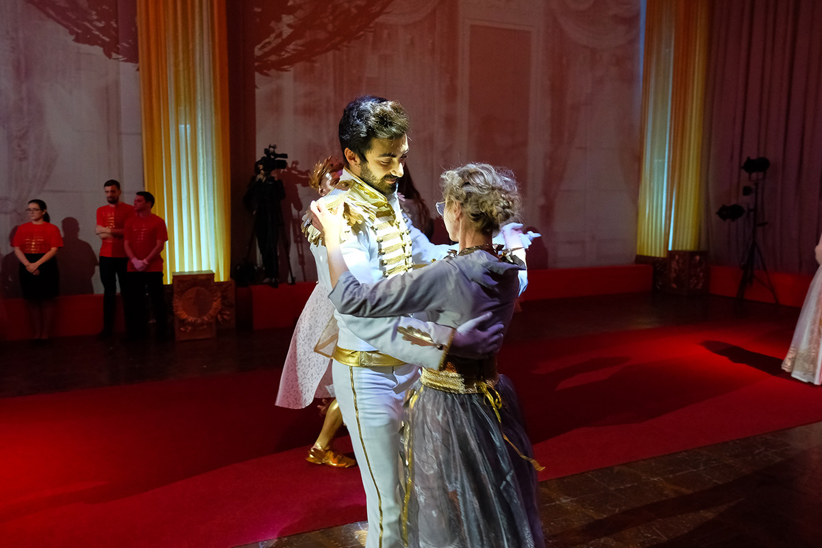 А вот бородатый гусар, в образе которого предстаёт «господин артист Марат Мударисов», — это с точки зрения исторической точности большое авторское допущение. Бороды в армии были запрещены, в отличие от употребления спиртных напитков, которыми этот персонаж явно не пренебрёг. Подвыпивший гусар будет прерывать певицу (с романсами перед началом бала выступает «госпожа артистка Екатерина Романова»), падать под ноги зрителям, пытаться завязать разговор с гостями… В этой роли, как и, например, в роли распорядителя бала («господин артист Алексей Каракулов») или роли старого полковника, в образе которого вволю чудит «господин заслуженный артист Российской Федерации Михаил Гасенегер», изрядно много импровизации, хотя поведенческая линия жёстко прописана режиссёром.