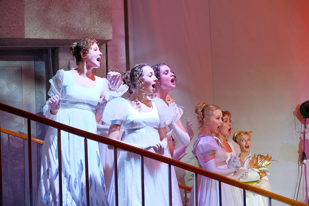Поблагодарить тех, кто протанцевал рядом с вами более часа, зрителям не удастся. Артисты не выйдут на поклоны. В финале спектакля панорамные окна большого фойе, до сих пор закрытые экранами, на которые проецировались пейзажи Петербурга рубежа XVIII—XIX веков, вдруг открываются, и зрители видят, как недавние танцоры выходят на улицу колонной с зажжёнными факелами.