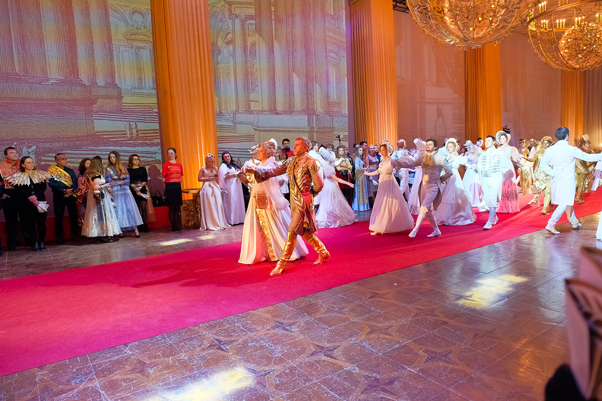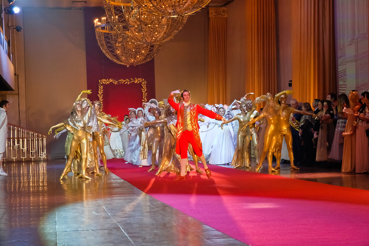 Всё это происходит в нижнем фойе, по которому прогуливаются нарядные персонажи. Вам тоже стоит принарядиться, отсюда второй совет: лучше всего одеваться просто в чёрное. Небольшое чёрное платье или брючный костюм — идеальный вариант, ибо поверх дамам предложат в специальной костюмерной газовую юбку в пол, пелерину, палантин, венок, а мужчинам — обшлага, воротнички, перевязи, орденские ленты… Всё золотое, серебряное, с имперским орнаментом. В дополнение к наряду вы получите аксессуары: программку в виде веера и карне — специальную бальную книжку для записи партнёров, которым обещаны танцы, — ещё и с карандашиком. Эти милые сувениры, так же как и некоторые другие приятные и вполне материальные сюрпризы, включены в стоимость билета.