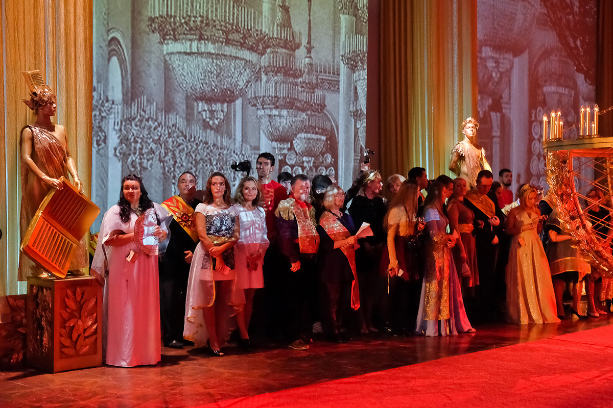 Среди гостей бродят режиссёр-постановщик Владимир Гурфинкель, украшенный значком «Войну и мир» прочитал», и директор театра Анатолий Пичкалёв, доверительным шёпотом сообщающий знакомым зрителям: «Я слышал, сегодня будет император!»