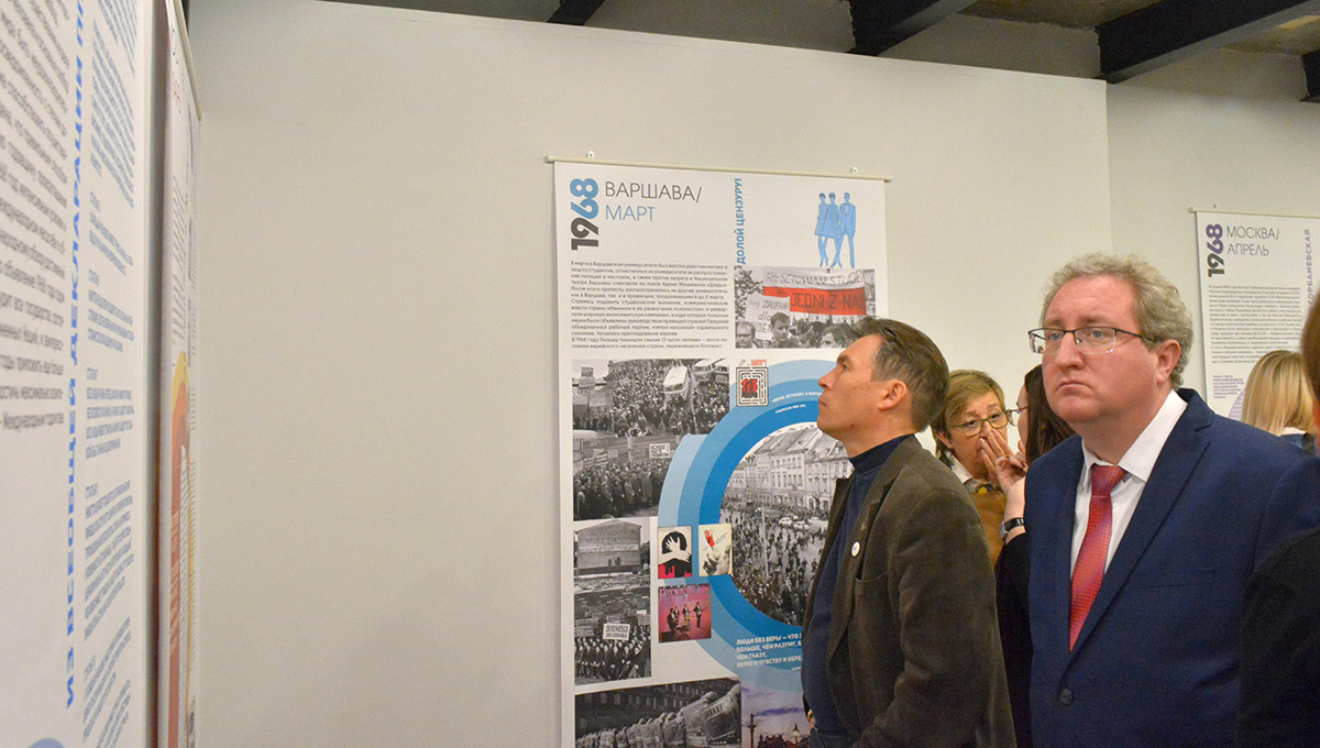 Председатель Пермского краевого отделения общества «Мемориал» Роберт Латыпов и уполномоченный по правам человека в Пермском крае Павел Миков на открытии выставки «1968 — год, который потряс мир»
