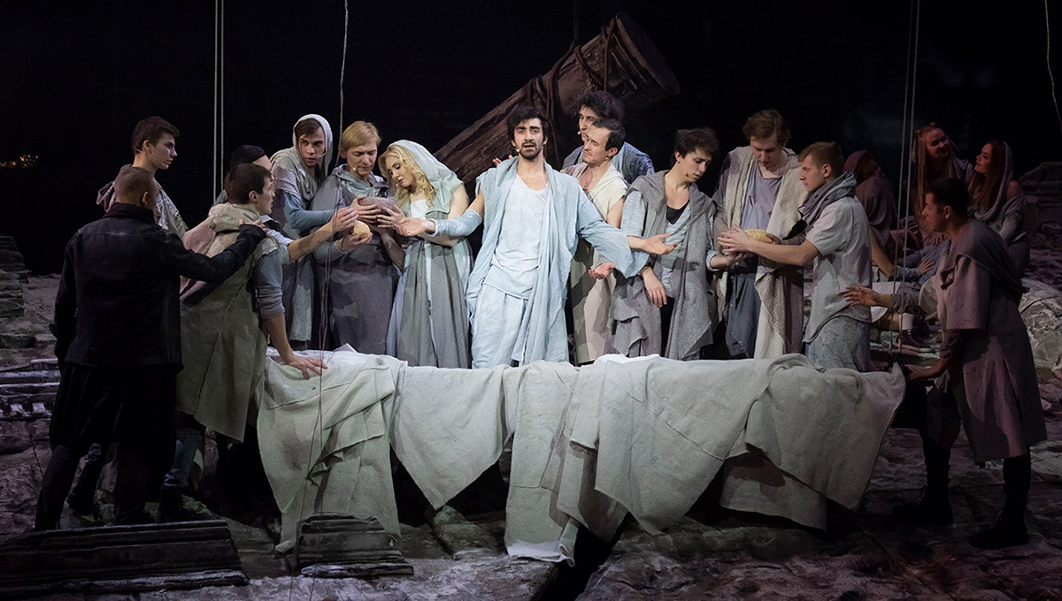 Словом, всё было бы неплохо, если бы не большой облом в финале. Сцены распятия нет. Ну, то есть вообще нет: пустая декорация, мольбы Иисуса за кулисами, а затем из развалин храма скромно, неловко и опасливо встаёт субтильный крест — просто две перекрещенные перекладины. Зритель не сразу понимает, что спектакль завершился, и начинает аплодировать как-то нерешительно.