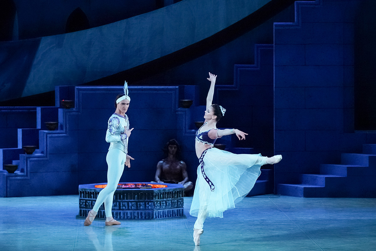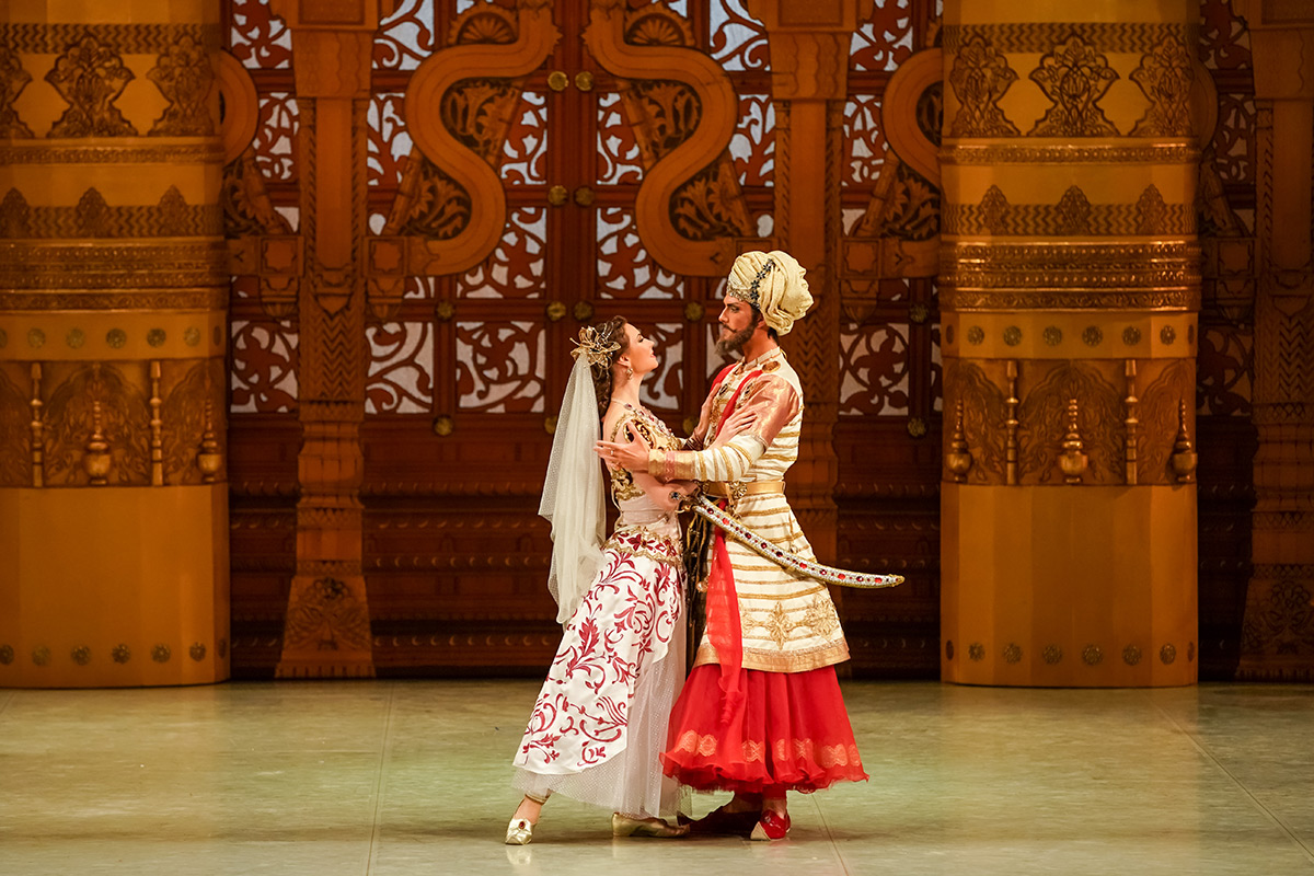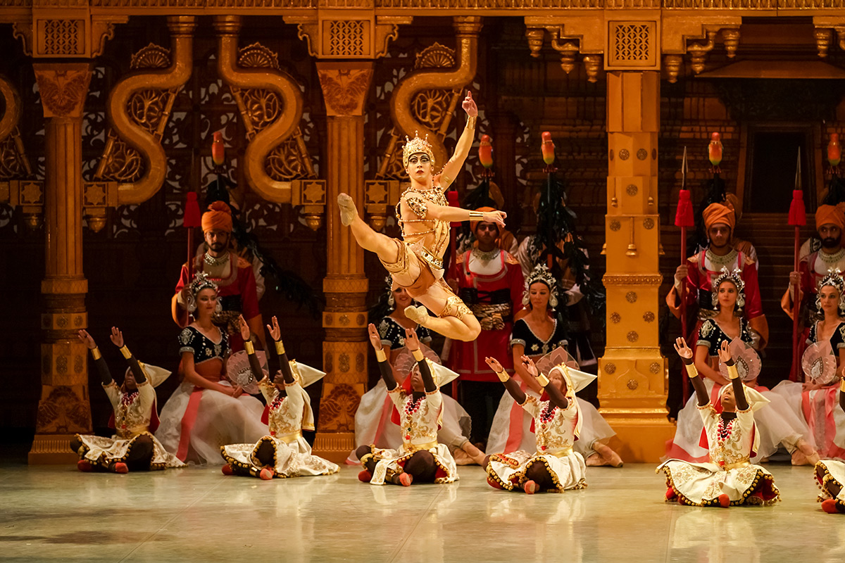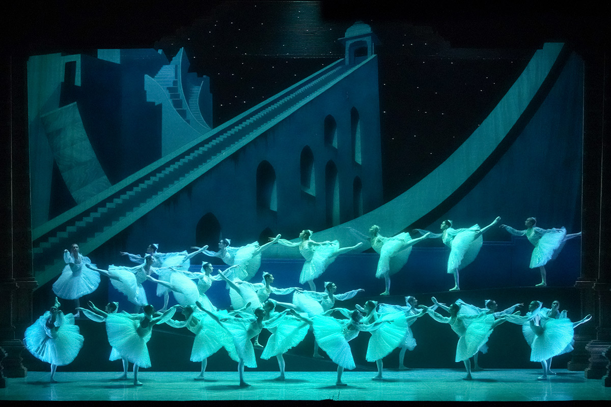 В первой картине на фоне звёздного неба вздымается грандиозная обсерватория Джантар-Мантар, во второй — сияет золотой резьбой дворец Моголов, и даже портреты Шах-Джахана и Мумтаз-Махал украшают интерьер. Кувшины, опахала и попугаи в руках танцовщиц, шкура тигра на плечах Солора… Алексей Мирошниченко со свойственной ему изобретательностью добавил нотку искренности и подлинности в этот индийский карнавал, пригласив студентов из Индии и Бангладеш в миманс на роли стражников. Они немного «деревянные», но в то же время очень настоящие.