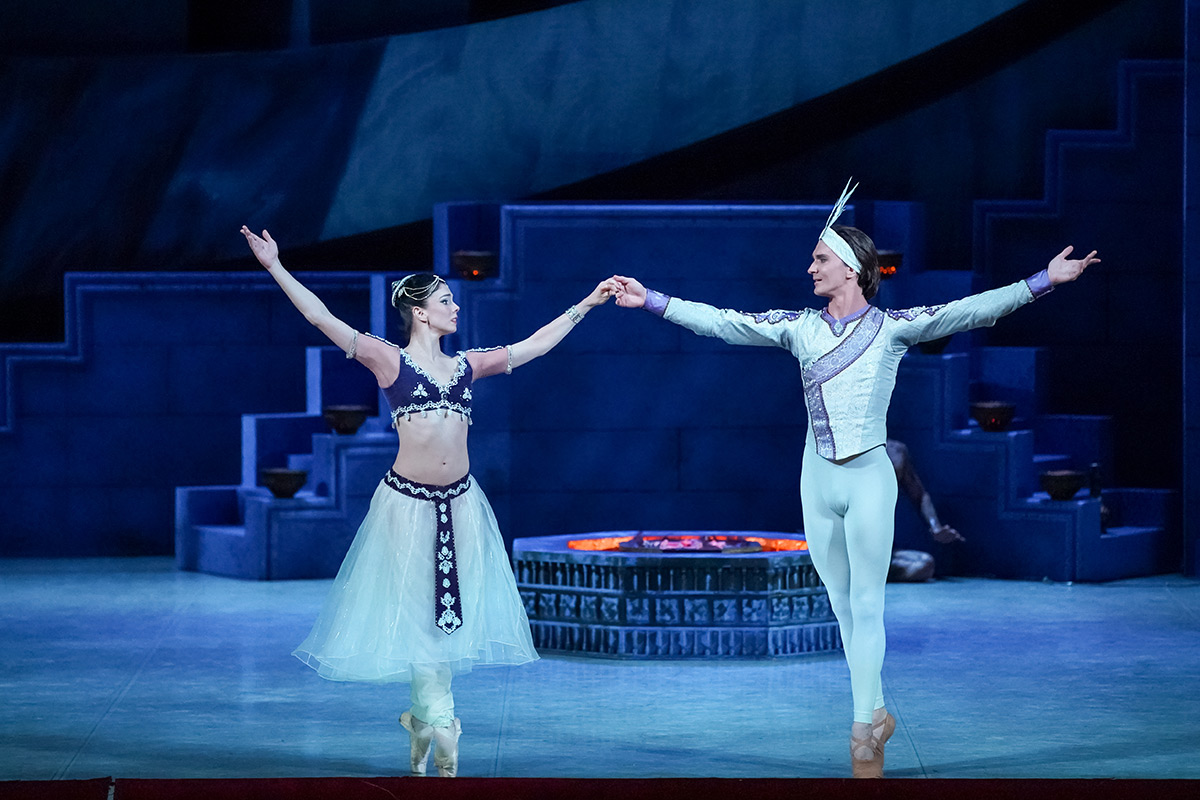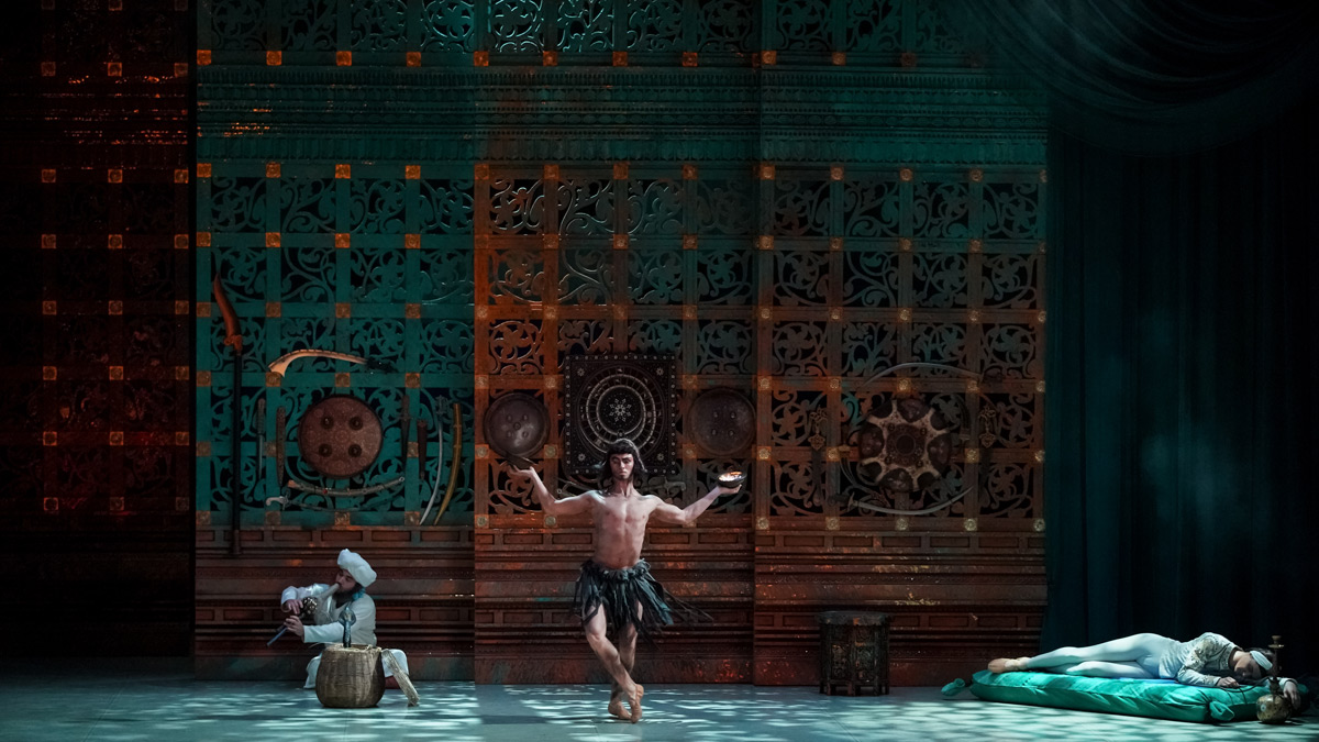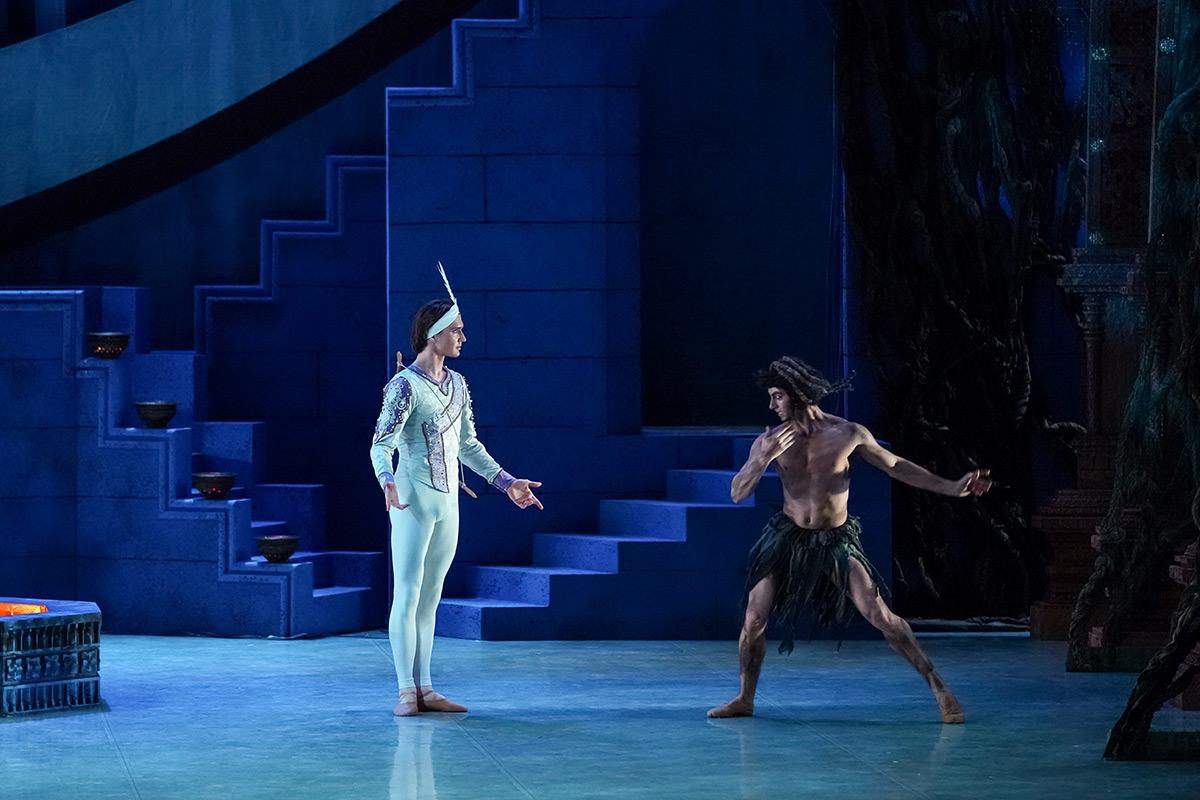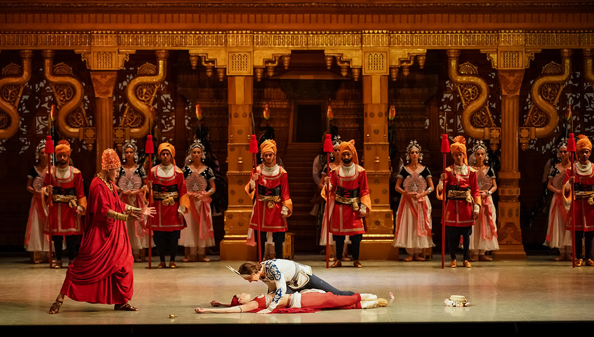 В первой картине на фоне звёздного неба вздымается грандиозная обсерватория Джантар-Мантар, во второй — сияет золотой резьбой дворец Моголов, и даже портреты Шах-Джахана и Мумтаз-Махал украшают интерьер. Кувшины, опахала и попугаи в руках танцовщиц, шкура тигра на плечах Солора… Алексей Мирошниченко со свойственной ему изобретательностью добавил нотку искренности и подлинности в этот индийский карнавал, пригласив студентов из Индии и Бангладеш в миманс на роли стражников. Они немного «деревянные», но в то же время очень настоящие.