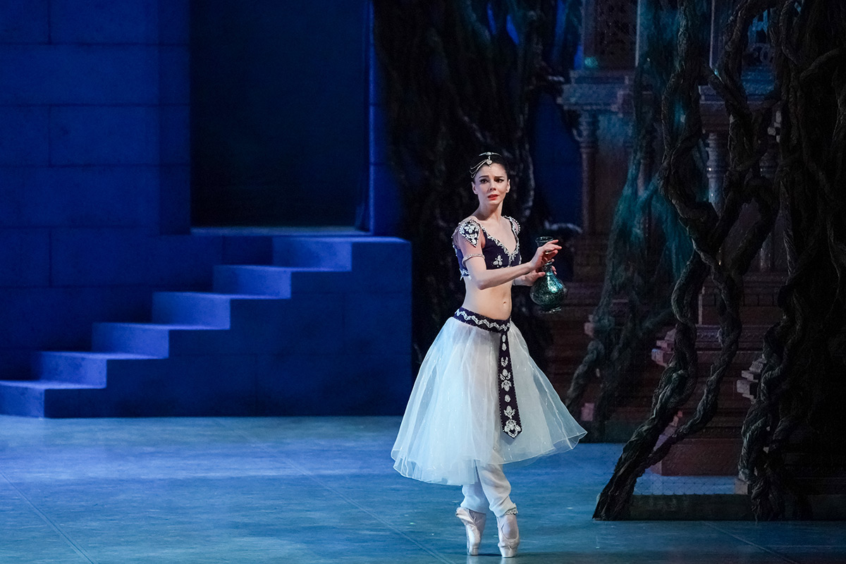 Даже в неистовом танце в финале второго акта Никия Осиповой — не просто танцовщица, а храмовый служитель, духовное лицо, для которого важна дисциплина, самоограничение и твёрдость духа. В переводе на язык хореографии это означает, что для Осиповой в этой партии важны не столько широкий шаг и эффектные акробатические жесты (всё это тоже есть), сколько правильное положение каждого пальца, идеальная плавность рук и поворот стоп. То, что надо для триумфа хореографии Петипа.