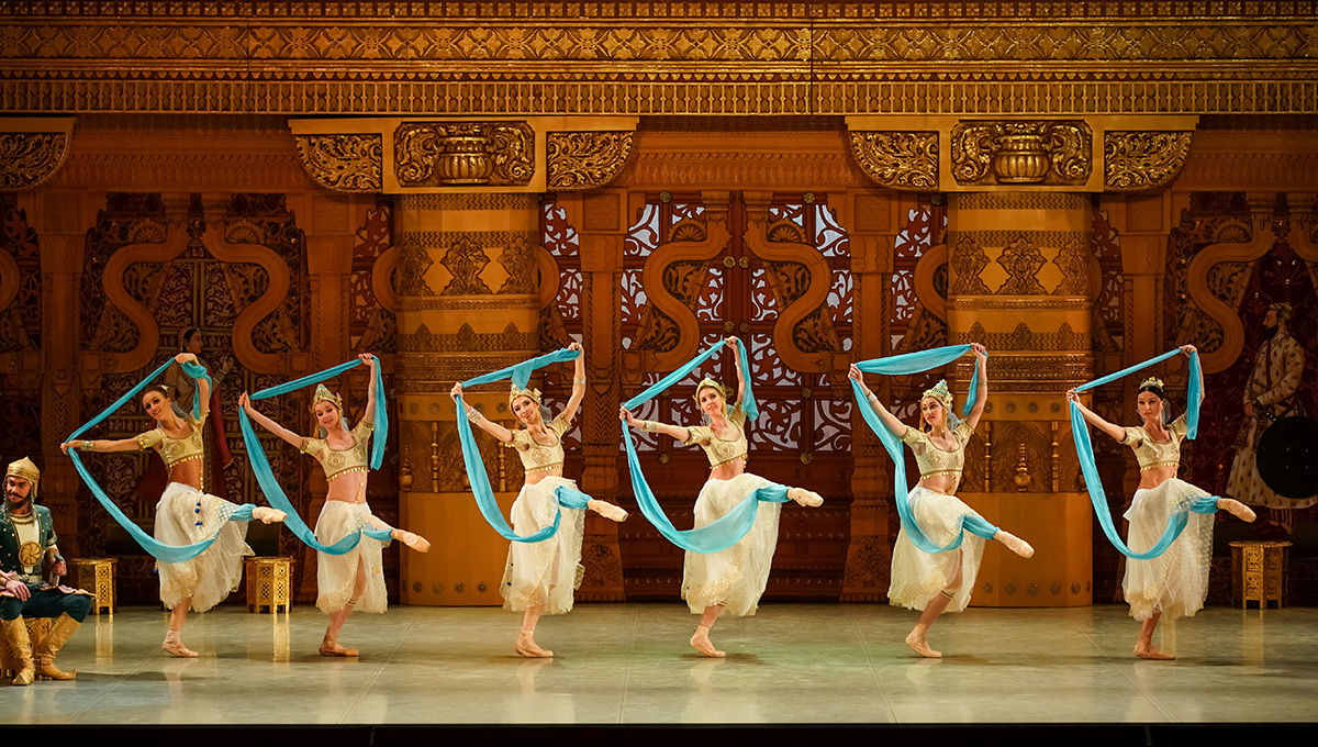 Пермская «Баядерка» — это далеко не только хореография. Трудно даже решить, кто тут в большей степени звезда — солисты-танцовщики или художники-постановщики Альона Пикалова (сценография) и Татьяна Ногинова (костюмы). О сценическом оформлении спектакля можно говорить очень долго. Роскошь и величие династии Моголов — достойный источник вдохновения для художника, и постановщики по-настоящему в него погрузились.