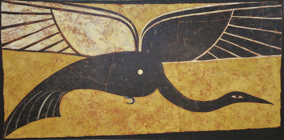 Затем можно подняться на второй этаж, где на «антресолях» расположилась персональная выставка Марии Владимировой «По обе стороны человека». Московская художница подарила Пермской галерее целую коллекцию своих работ, но в экспозиции не только дары, но и другие работы, раскрывающие Владимирову как самобытного, глубокого, эмоционального художника, блестящего мастера фактуры и колорита. Картины и графика Марии Владимировой — это сочетание ярких, декоративных образов и огромной литературной эрудиции. Она любит помещать на свои холсты большие объёмы текста, увлечённо работает с экзотическими шрифтами, любит сложную технику и оригинальные визуальные приёмы.