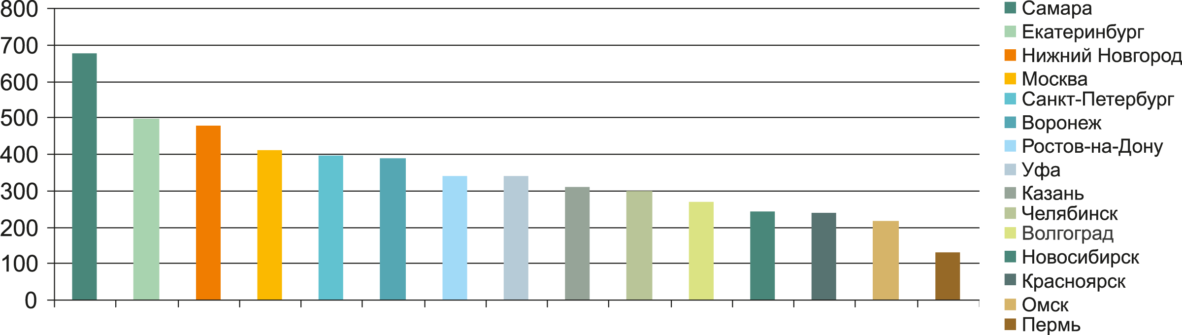 Эксперты по-разному оценивают количество качественных торговых объектов (торговых центров), которыми располагает город. Но в любом случае речь идёт о считаных единицах. При этом, отмечает Евгения Сафонова, аналитик департамента исследований Cushman & Wakefield, почти все крупные торговые объекты (кроме ТЦ «СпешиLove») были открыты более 10 лет назад и сейчас нуждаются в обновлении или реконцепции.
