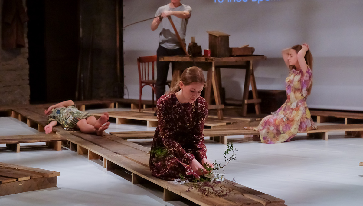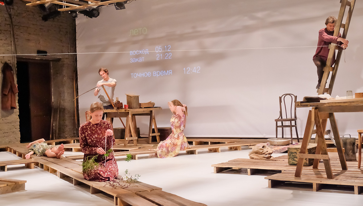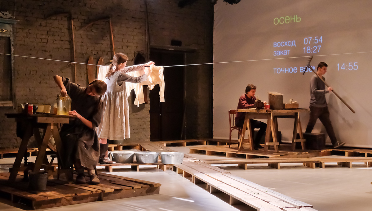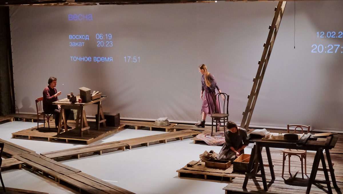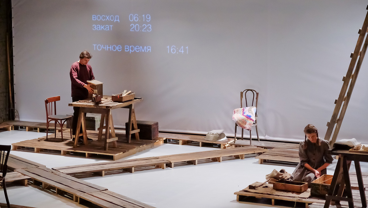 На протяжении всего спектакля актёры перемещаются строго по половицам, не ступая за их пределы. Правильно! Это ведь тротуар — в прикамских деревнях, как в песне Городницкого, они действительно до сих пор деревянные и скрипят, как половицы. Не стоит ступать за их пределы — там грязь.