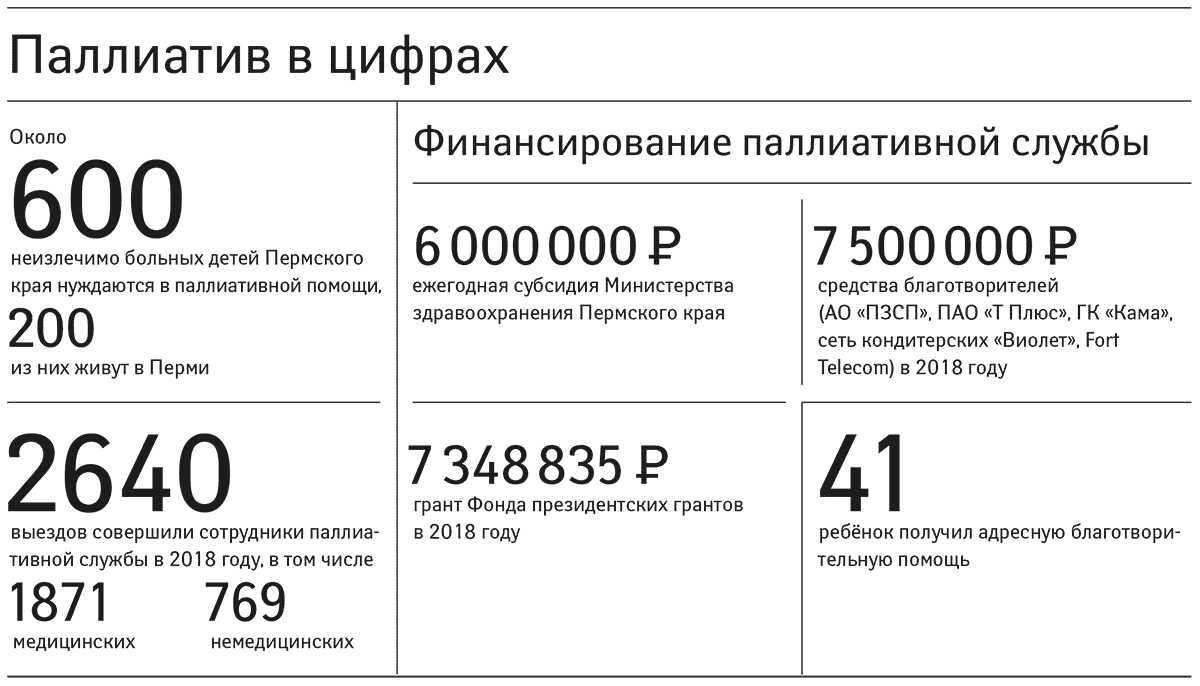 Пять лет назад в Пермском крае о паллиативной помощи было не принято говорить вслух. Буквально за два года усилиями благотворительного фонда «Дедморозим» и краевых властей в этом направлении сделан колоссальный прорыв. Именно в Перми частный фонд смог впервые получить медицинскую лицензию, а также открыть бесплатный прокат оборудования для семей со смертельно больными детьми. Посыл такой: когда жизнь ребёнка ограничена детством, лучше дать ему больше жизни, чем пытаться вылечить не поддающиеся лечению заболевания.