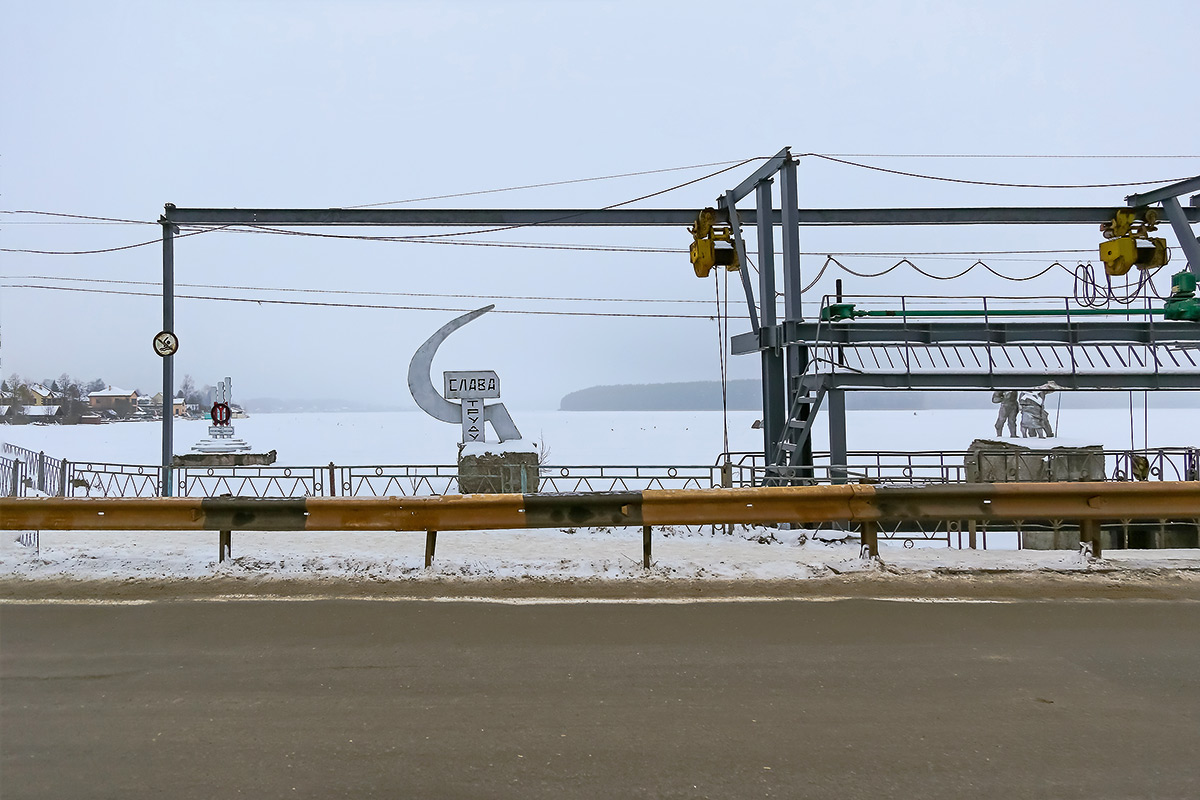 Здесь, в окрестностях плотины одного из самых больших прудов в Европе, некоторые даже говорят — самого большого, времена сошлись в одной точке, в одном фокусе. Вот — удивительная советская экстраваганца: три монумента, установленные на массивных постаментах прямо в воде пруда. Классическая до рези в глазах гипсовая скульптура героев советского эпоса — космонавта, сталевара и девушки с колосьями, а на соседнем постаменте, как расшифровка смысла скульптурной композиции, — надпись «Слава труду». А на третьем… На третьем была, разумеется, «Слава КПСС», пока тёмной августовской ночкой посреди 1990-х годов её не утащили отважные охотники за металлоломом. Теперь на третьей опоре — логотип Очёрского машиностроительного завода, установленный здесь в 2011 году. Вот и связь времён!