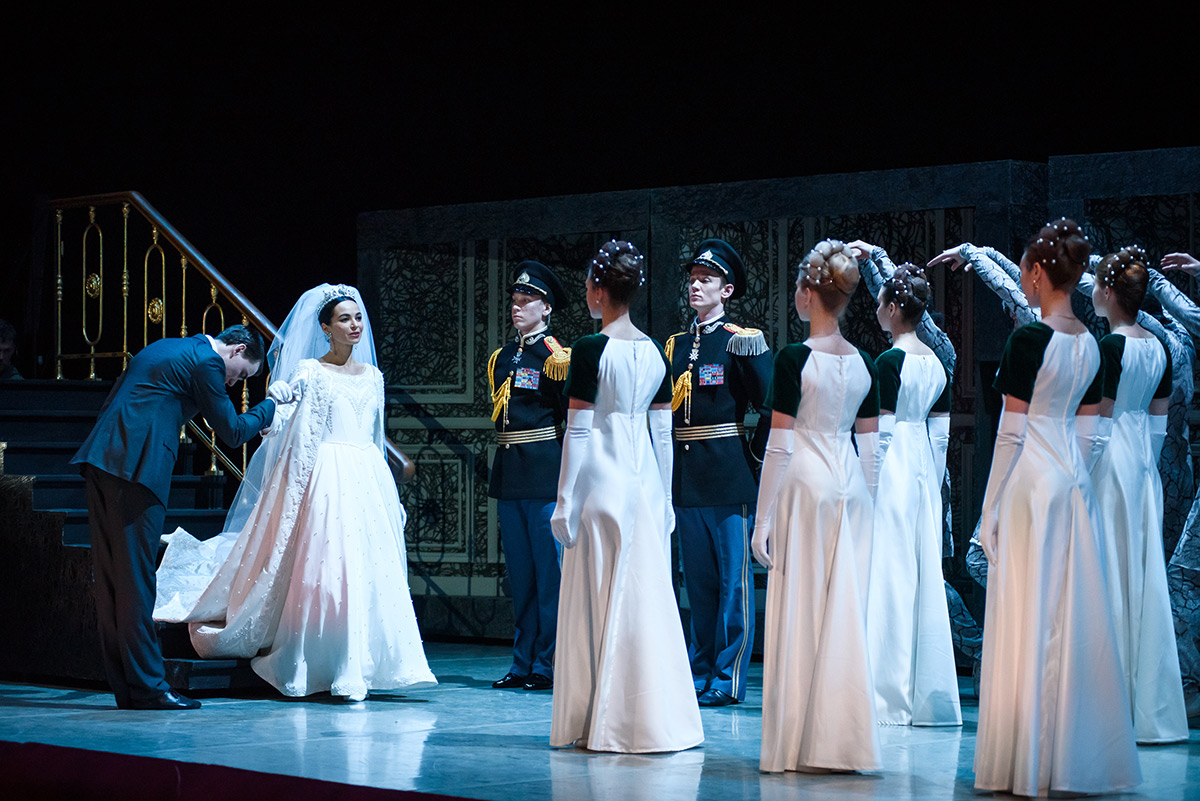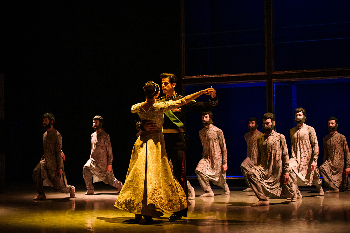 В общем, всё чинно-благородно. На протяжении всего балета исполнительница роли императрицы с достоинством несёт свою царственность, успевая девять раз за 50 минут стремительно переодеться во всё более роскошные наряды. Вроде бы для неё предусмотрено три роли: беззаботная студентка, страстная новобрачная, достойная супруга, и у всех этих ипостасей разный хореографический рисунок; но почему-то запоминается последняя роль, для которой хореограф выбрал приёмы из арсенала драмбалета — элегантные проходы через сцену, эмоциональная мимика и выразительная жестикуляция. На протяжении довольно длинных промежутков времени шахская чета просто стоит в центре сцены в луче света (красивая работа художника по свету Алексея Хорошева), окружённая толпой.