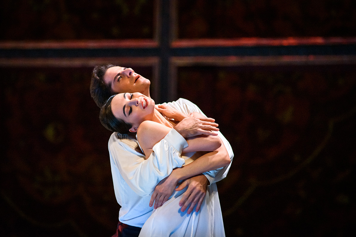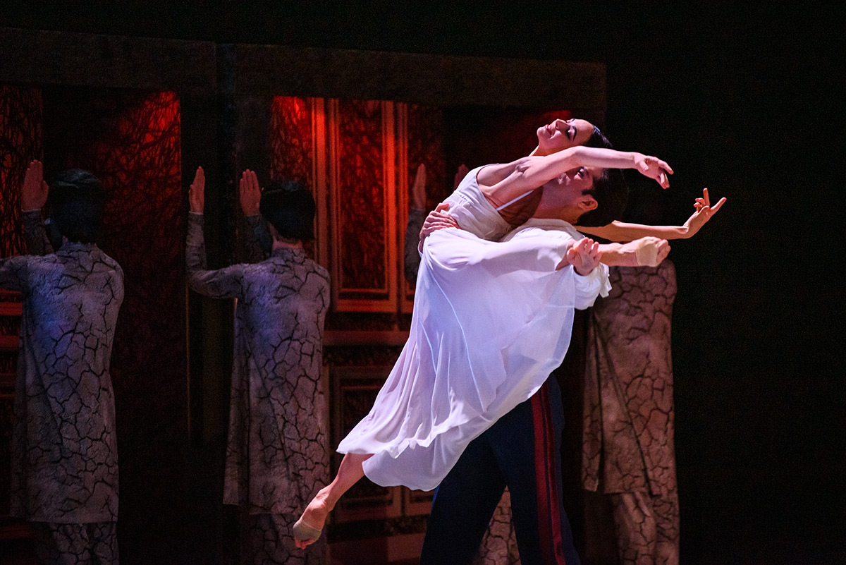 Да, массовые танцы сделали этот балет. Особая удача — придуманные Мирошниченко образы Бессмертных, этакие «тени забытых предков», покрытые растрескавшейся глиной фигуры, которые в прологе сходят со старинных барельефов. Их танец, загадочный и довольно активный, сопровождает героиню на всём жизненном пути. Заодно они и лайтбоксы по сцене двигают, позволяют обойтись без рабочих, разрушающих сценическую реальность.