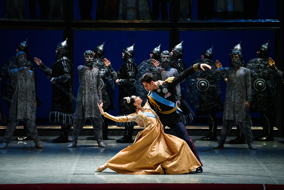 Может быть, главные партии выглядят недостаточно выразительно, потому что вокруг — изобретательный народно-сценический танец: ткачи с коврами, чеканщики с золотыми блюдами, водоносы с кувшинами, и все пляшут, и все пляски остроумно придуманы в народной стилистике. Неудивительно, что хореограф отказался от пуантного танца: народно-сценический никогда в пуантах не танцуют.
