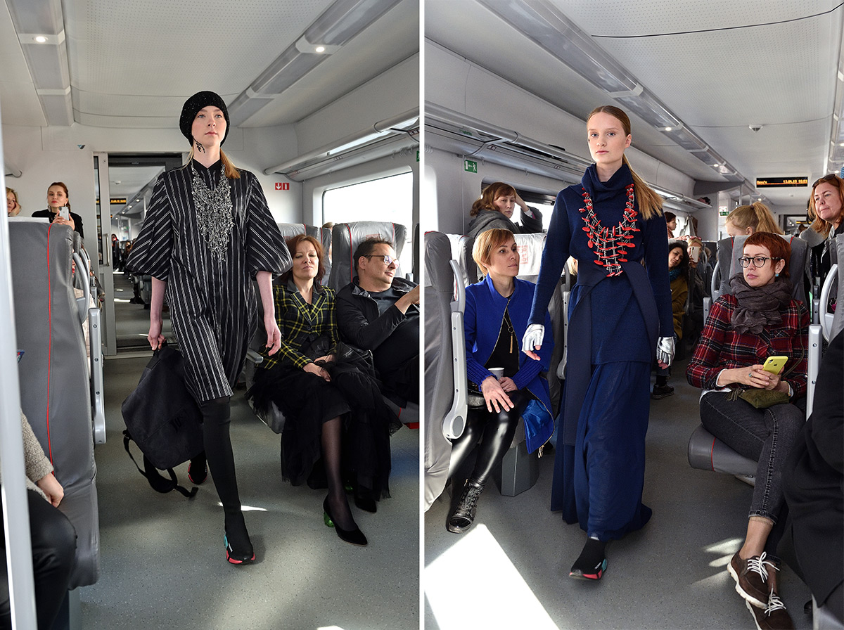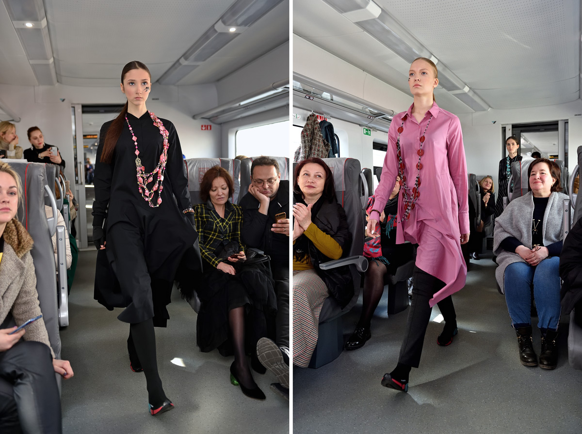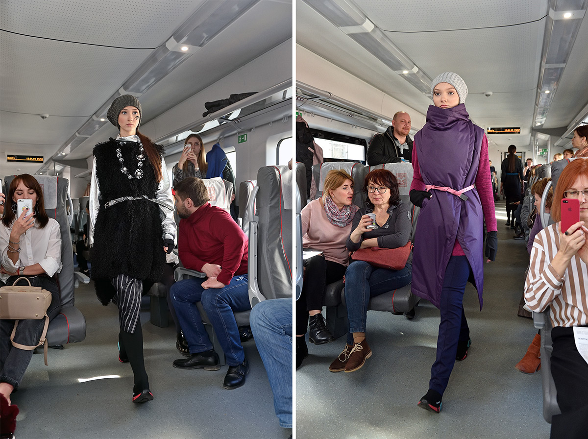 Дизайнеры Алексей Ворон, Евгения Гребенщикова и Иван Алёшин устроили весенний показ даже не на вокзале, а в электричке — новой «Ласточке»