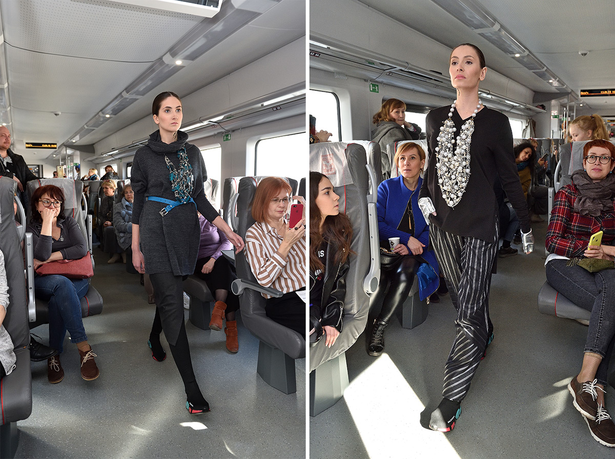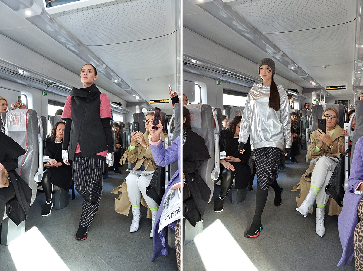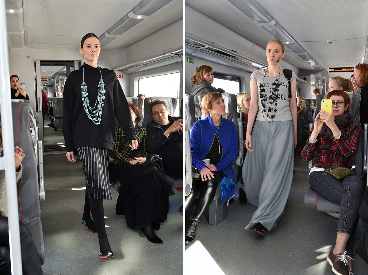 Дизайнеры Алексей Ворон, Евгения Гребенщикова и Иван Алёшин устроили весенний показ даже не на вокзале, а в электричке — новой «Ласточке»
