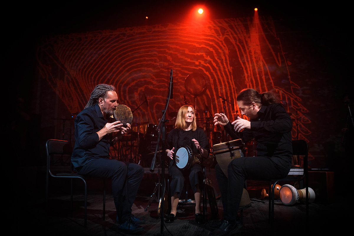 Первый же взгляд на сцену приводил в восхищение: грандиозная перкуссионная установка, состоящая из десятков ведомых и неведомых инструментов, как классических ударных, так и этнических, сияла в подвижных лучах света на фоне огромной колеблющейся окружности на экране (художник по свету — Евгений Мезенцев, видеоарт Ильи Протасова). Количество занятых в постановке инструментов — около полусотни: от ханга до пу-барабана, всевозможные балафоны и дарбуки, конги-бонги, калимбы-маримбы... В общем, это было не только красиво, но и познавательно. На этом можно было бы поставить точку — уже сама по себе эта инсталляция была прекрасна; но, разумеется, красовалась она не сама по себе, а ради музыкального шоу, которое могло бы достойно участвовать в любом европейском джазовом фестивале.