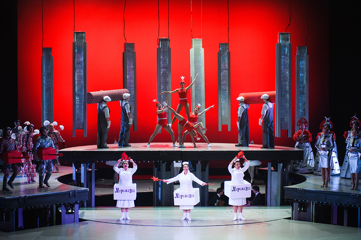 Впрочем, постановщики спектакля постарались сделать всё, чтобы скрасить нелепости сюжета и вопиюще ходульные диалоги интересными визуальными решениями. Невозможно не восхититься изобретательностью художника по костюмам Ирэны Белоусовой, которая придумала абсолютно уморительные образы танкистов, мороженщиц, матрёшек, грузин с шашлыками, якутов, узбеков — все такие карикатурные и в то же время узнаваемые! Не в меньшей степени это заслуга Бориса Мильграма: костюмов не было бы, если бы он не придумал этих персонажей. Дама с серпами и молотами на выдающемся накладном бюсте — ещё та издёвка над известной символикой, а Дознаватель — кавалерист, слившийся со своей лошадью, — вообще, как пишут в соцсетях, «агонь»!