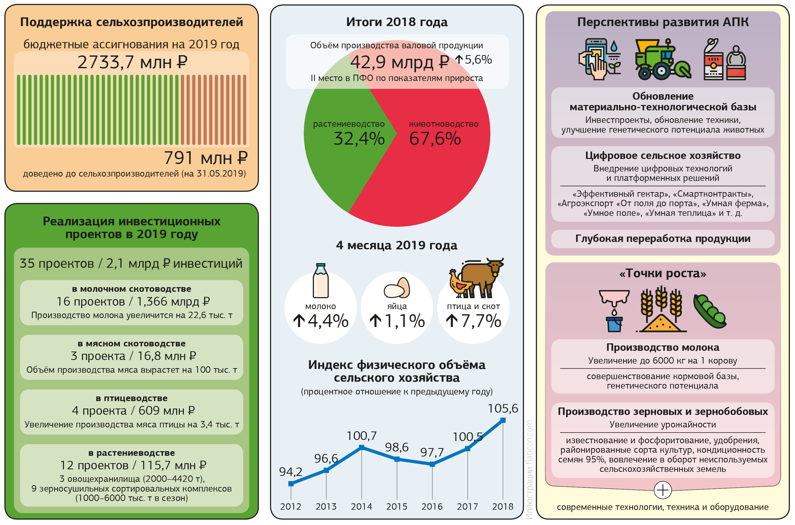 В своём докладе теперь уже бывший министр сельского хозяйства и продовольствия Пермского края Александр Козюков (4 июня его на этом посту сменила Оксана Бреднева) добавил, что в этом году 16 инвестиционных проектов реализуется в молочном скотоводстве, 12 — в растениеводстве, четыре — в птицеводстве, три — в мясном скотоводстве. «Ожидаем, что в результате реализации инвестпроектов производство молока увеличится на 22,6 тыс. т в год, мяса — на 100 т, а производство мяса птицы к 2020 году должно увеличиться на 3,4 тыс. т», — рассказал он.