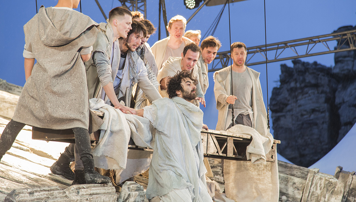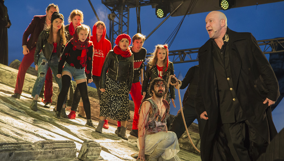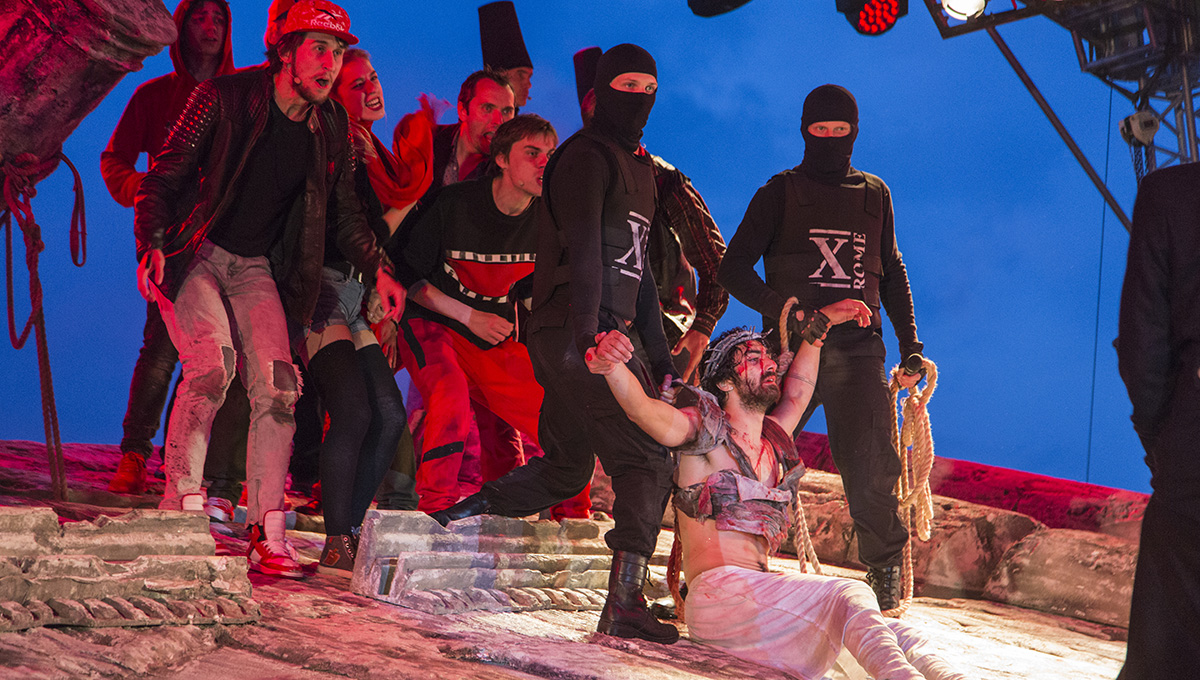 Холоднющий ливень разразился как раз тогда, когда Марат Мударисов на авансцене, стоя на коленях, пел «Моление о чаше». Толпы фотографов, невзирая на потоки воды, рванули, чтобы запечатлеть момент, как насквозь промокший артист с особой искренностью поёт свою партию, тем самым доказывая, что в жизни всегда есть место подвигу. Оркестр на авансцене, предусмотрительно закутавшийся в разноцветные дождевики, мужественно держал строй. Было тревожно и за виолончели со скрипками, и за ангельский голос Анны Сырчиковой — Магдалины.