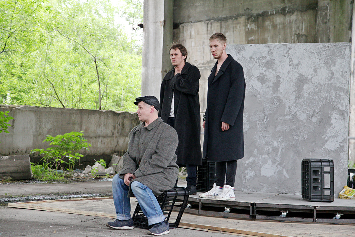 Самодеятельный театр «Студия М» — тоже из Челябинска — на фоне инфернальных огней и дымов коксохимического завода показал медитативный перформанс «Охотники» по очень отдалённым мотивам картины Питера Брейгеля-старшего «Охотники на снегу».