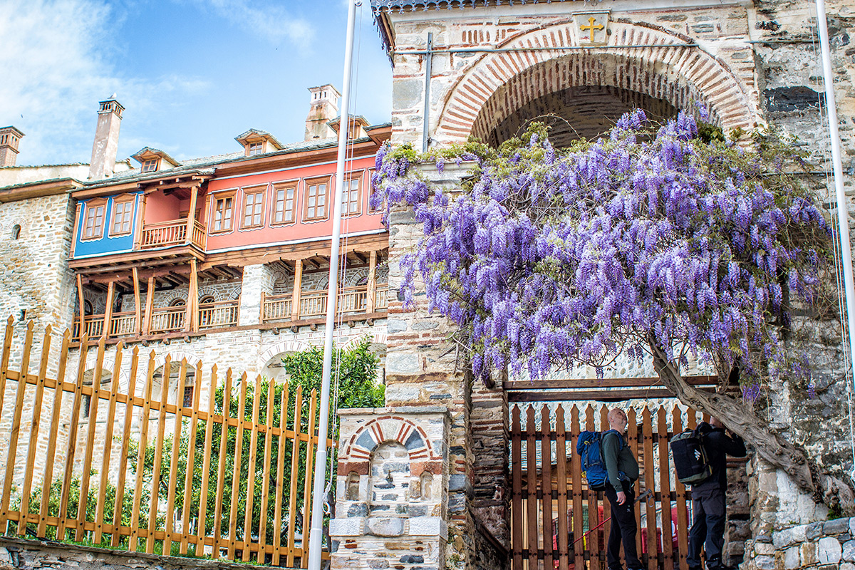 Поскольку по Афону положено перемещаться пешком, мы так и поступили. Монастырь Ксенофонт, до которого мы добрались довольно быстро, меньше, но старше Пантелеимонова, тут всего 30 насельников. Совершенно другие ощущения, порядки, расписание молитв. Например, утренняя молитва начиналась в 8:30. Вечерняя служба больше напоминала театральное действие. Из 20 монастырей на Афоне 17 (исключения — русский, сербский и болгарский) — греческие. Мы спросили благословения остаться в Ксенофонте на ночлег и получили место в «архондарике» (монастырской гостинице для паломников).