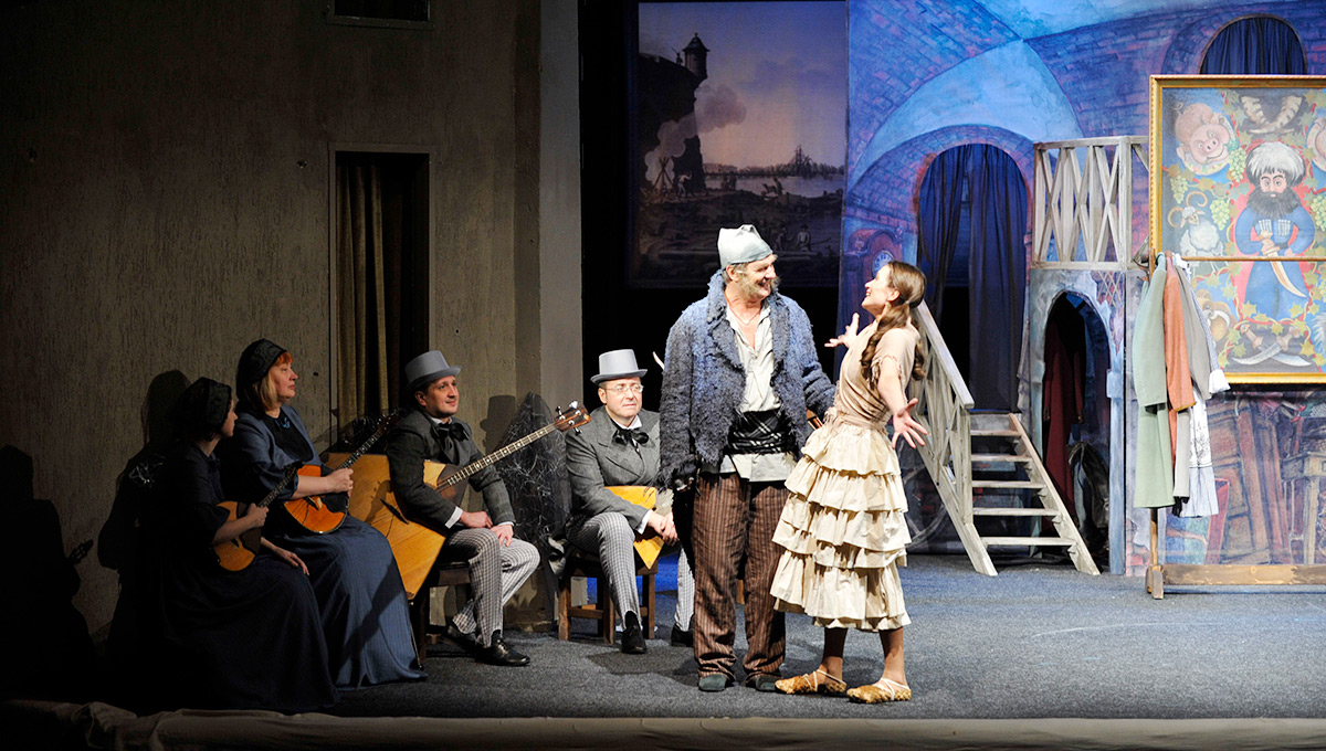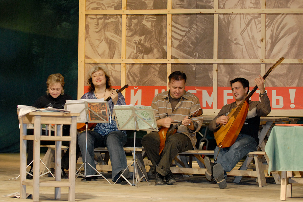 Сколько всего вошло в спектакль! Детвора хохочет, когда мы играем мелодию «Нокиа». Детскую песню о дружбе мы перевели в романс, в марш, в кадриль, а в финале я играю её мотив на балалайке отдельными нотами, словно капельки падают. Чуть другая гармония, другие акценты — и песня звучит трагически.
