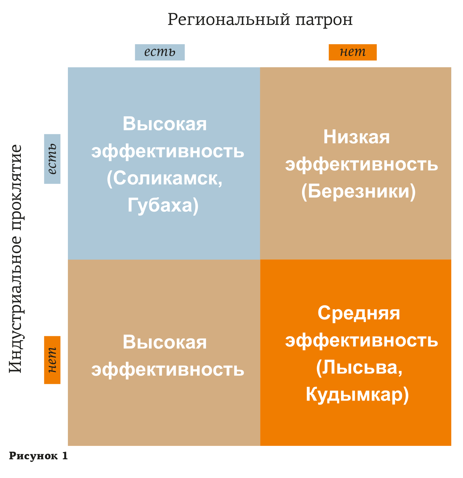 Несмотря на то что в Соликамске и Губахе есть мощные промышленные предприятия, фактор индустриального проклятия не проявляет себя в ситуации наличия регионального патрона. По нашей оценке, в Соликамске роль патрона выполняет президент АО «Соликамскбумпром» и депутат краевого Законодательного собрания Виктор Баранов, который ещё в 2016 году, пользуясь особыми отношениями с губернатором Виктором Басаргиным, смог обеспечить занятие позиции мэра города выходцем со своего предприятия. В Губахе патронаж осуществляют председатель совета директоров ПАО «Метафракс» и депутат краевого Законодательного собрания Армен Гарслян, а также бывший мэр города, а ныне министр территориального развития Пермского края Александр Борисов.