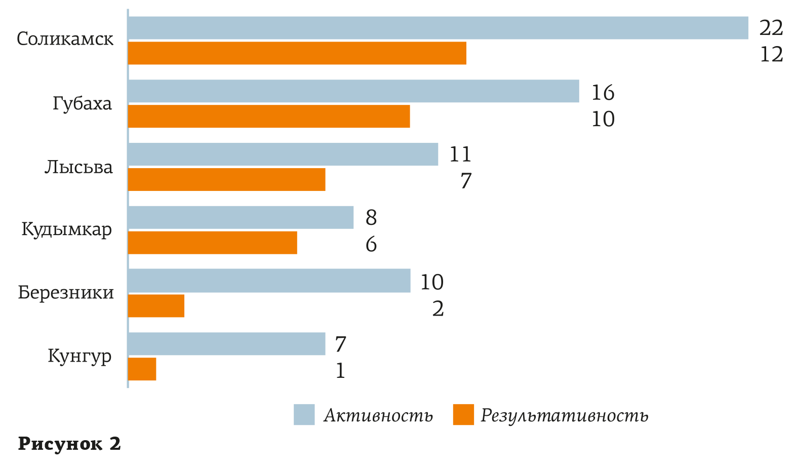 Березники представляют собой диаметрально противоположный случай. Нынешний мэр Сергей Дьяков впервые занял свою позицию, выиграв всенародные выборы в 2010 году. В 2015 году он сохранил свой пост, успешно пройдя через новую конкурсную процедуру. Из шести исследуемых городских округов он является единственным мэром, который не подвергся ротации после смены правил избрания муниципальных глав. Экономический потенциал местных предприятий настолько велик, что региональные власти предпочитают не обострять ситуацию. Именно директорат местных предприятий, а не региональные власти, определяет кандидатуру мэра. Поэтому глава города лишён особого контроля со стороны регионального патрона и опирается прежде всего на локальную элиту. Отсутствие регионального патрона при наличии мощных индустриальных предприятий приводит к тому, что у мэра Березников нет особых стимулов для кропотливой работы по созданию качественной конкурсной документации. Низкое число поддержанных заявок говорит именно об этом.