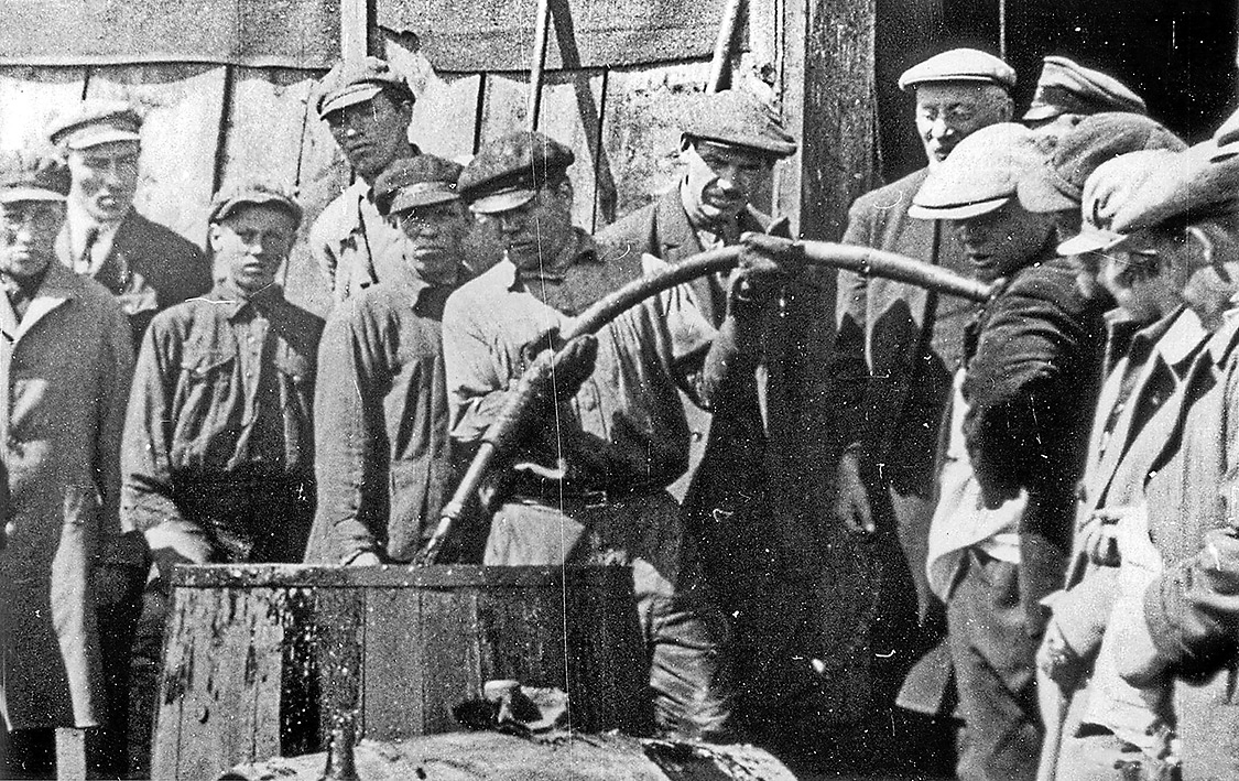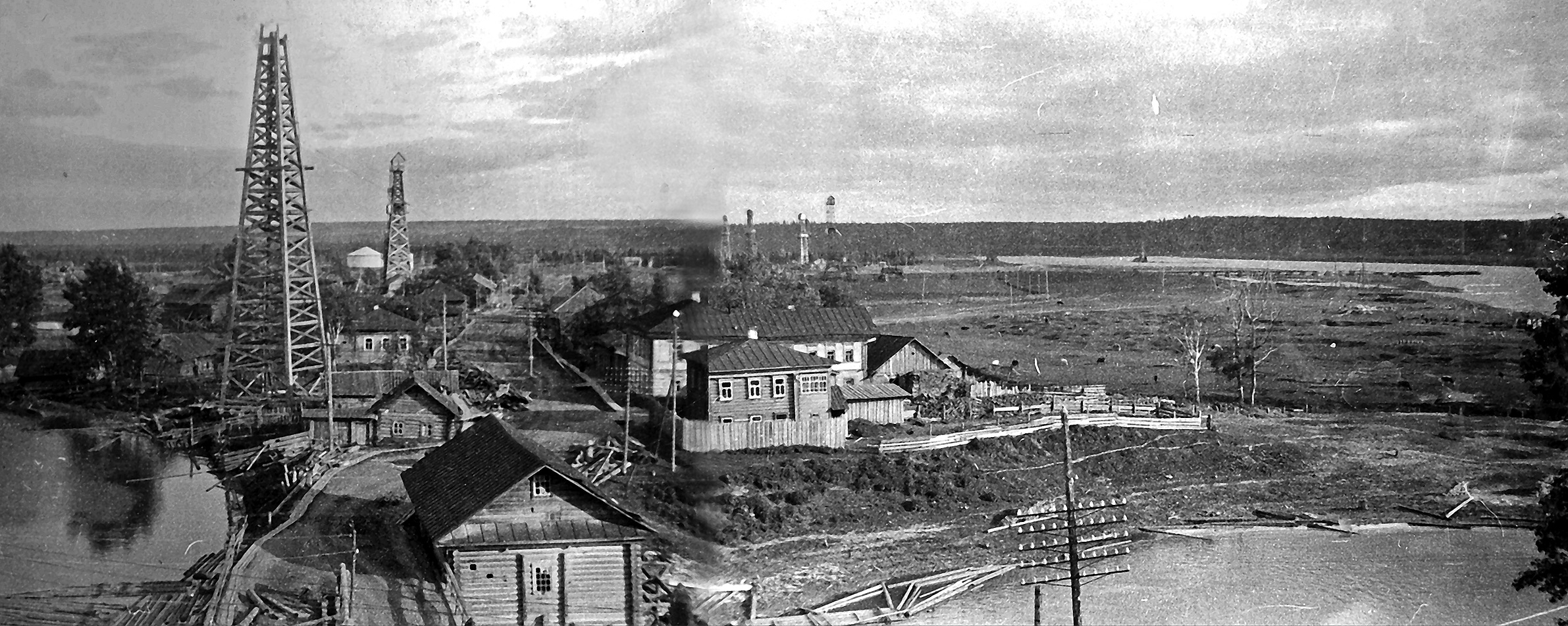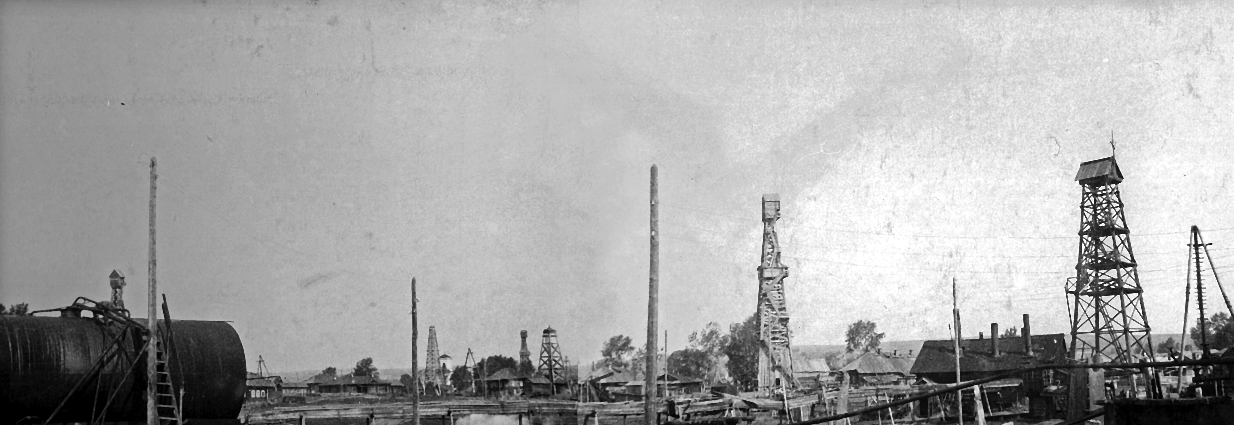 Панорама Верхнечусовского нефтепромысла, срава — скважина-«бабушка», 1934 год