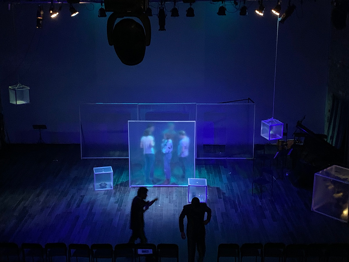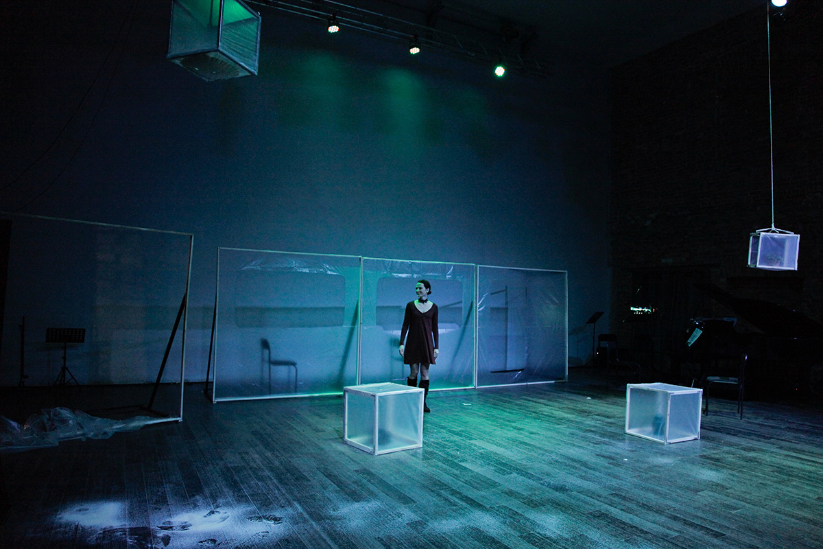 «Вещный» мир, окружающий героя, создала известная пермская художница Ольга Молчанова-Пермякова. Это инсталляция из полупрозрачных кубов, освещённых изнутри, в которых находится что-то из прошлого персонажей. Сценографию дополняет видео. Всё это было бы, наверное, очень красиво... Если бы предметы внутри кубов были видны. Возможно, сказался недостаток опыта в работе с театром (Ольга Молчанова-Пермякова вообще-то живописец), но за мутной плёнкой эти предметы не угадываются, не читаются — даже с первого ряда, поэтому инсталляция оказывается чем-то отдельным от текста и действия. Впрочем, это недостаток небольшой: стоит немного поработать с фактурой, где-то (там, где не нужно протыкать зонтиком) заменить плёнку плексигласом или другим более прозрачным материалом, и будет просто отлично.