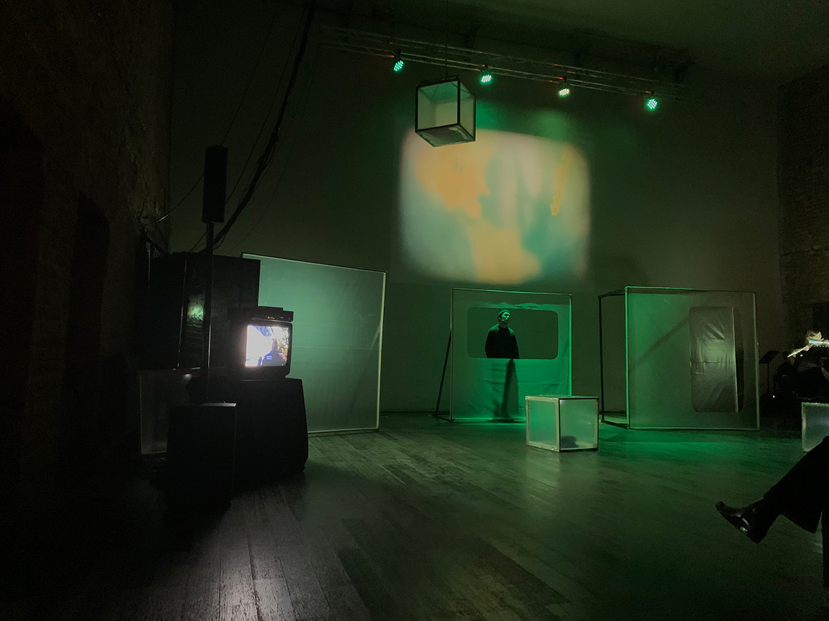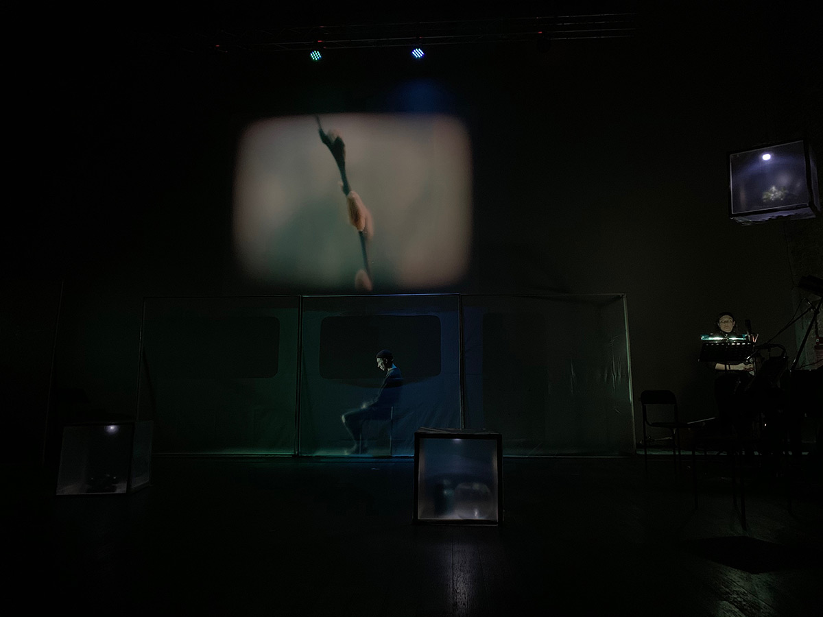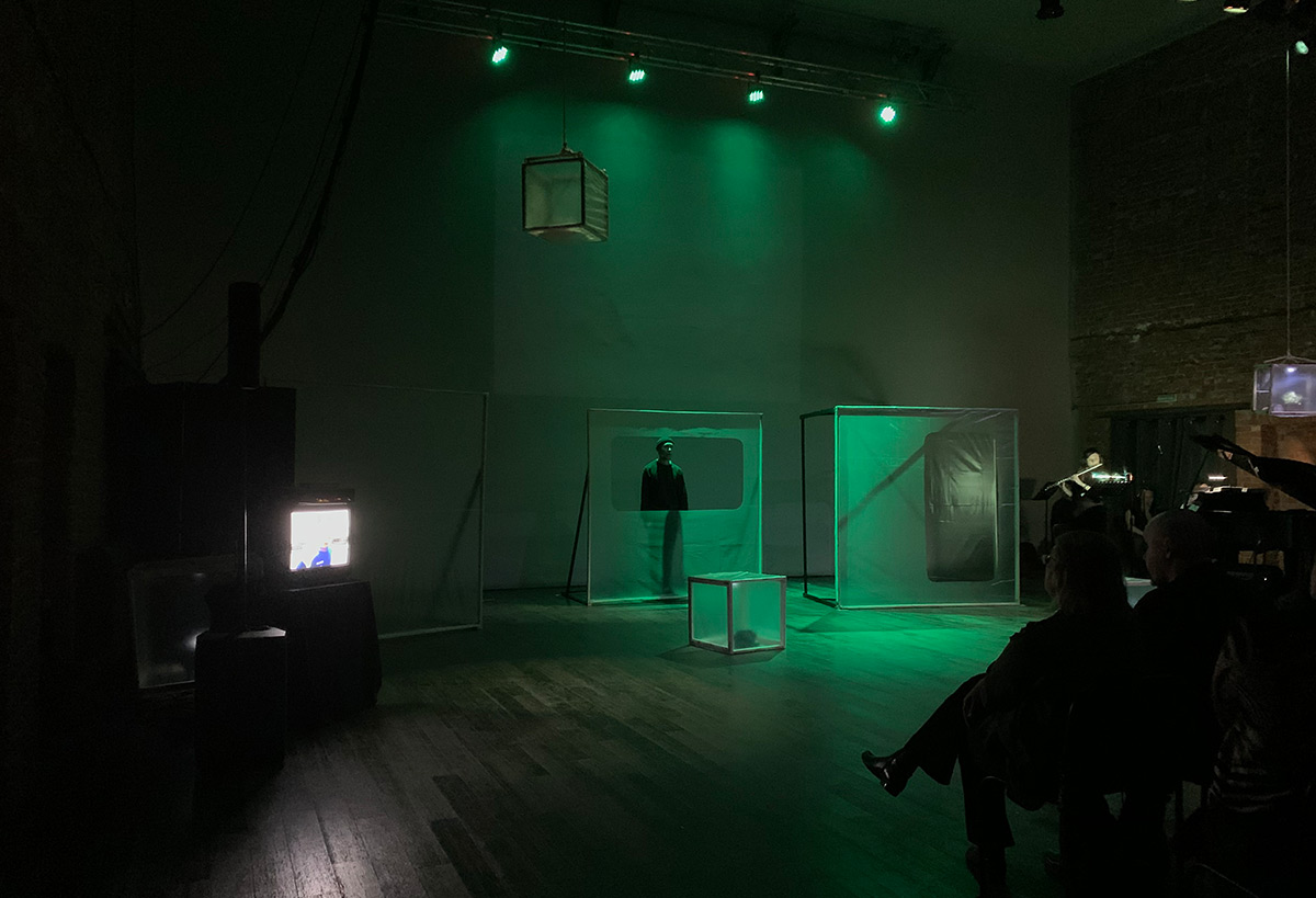 По замыслу авторов, предметы, находящиеся на сцене, должны будить у героя ассоциации и служить путеводными ниточками в прошлое, приводить к тени деда, в роли которого узнаваемый даже в виде тёмного силуэта Михаил Шестаков из того же театра «Новая драма». Герой, откликаясь на случайные раздражители, пытается прорваться сквозь плёнку — завесу времени — к этой тени, и в финале спектакля прорывается-таки — а там никого нет, разумеется.