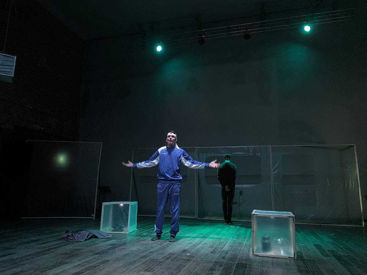 Иногда возникает впечатление, что режиссёр боится жанра моноспектакля и старается от него уйти. Ничем иным невозможно объяснить появление на сцене поэта-бегуна Евгения Гусева.