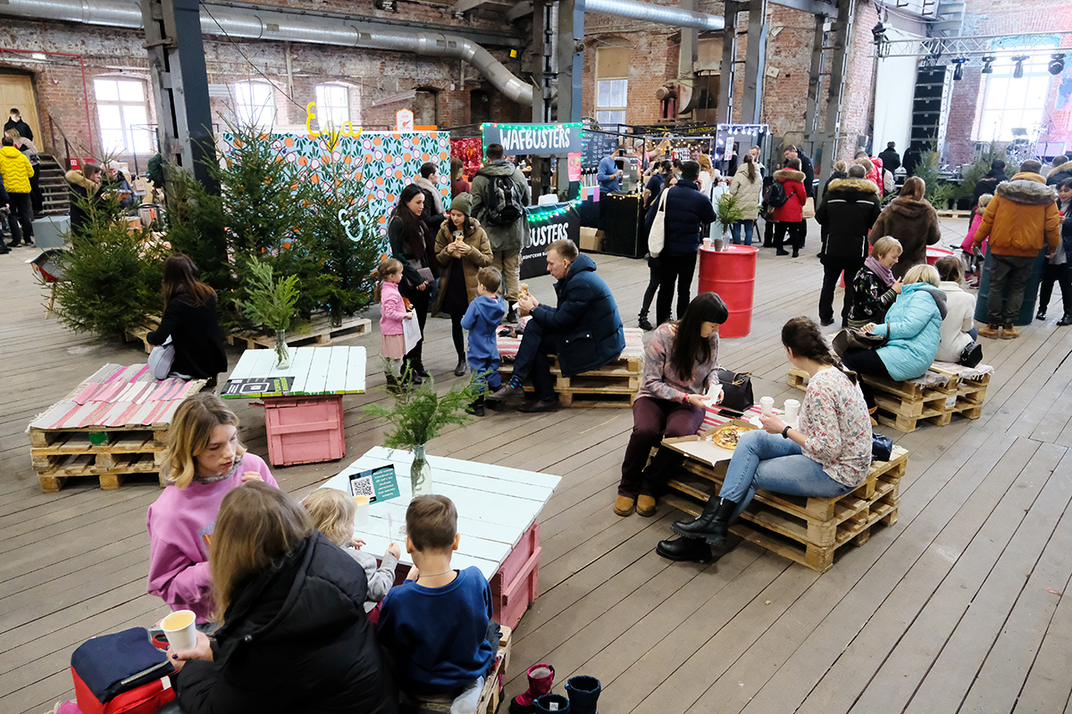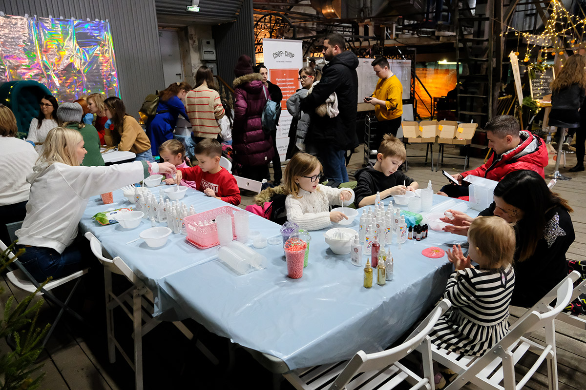 В зоне мастер-классов стихийно возникло пространство для детей и родителей. Здесь им предлагалось вместе порисовать, красиво упаковать подарок, сделать новогодний венок и даже снять собственный мультик. «Дома таким заниматься не будешь, а тут есть и компания других детей, и ведущий, можно отдохнуть немного, отвлечься», — рассказала Мария, мама шестилетнего Павлика.