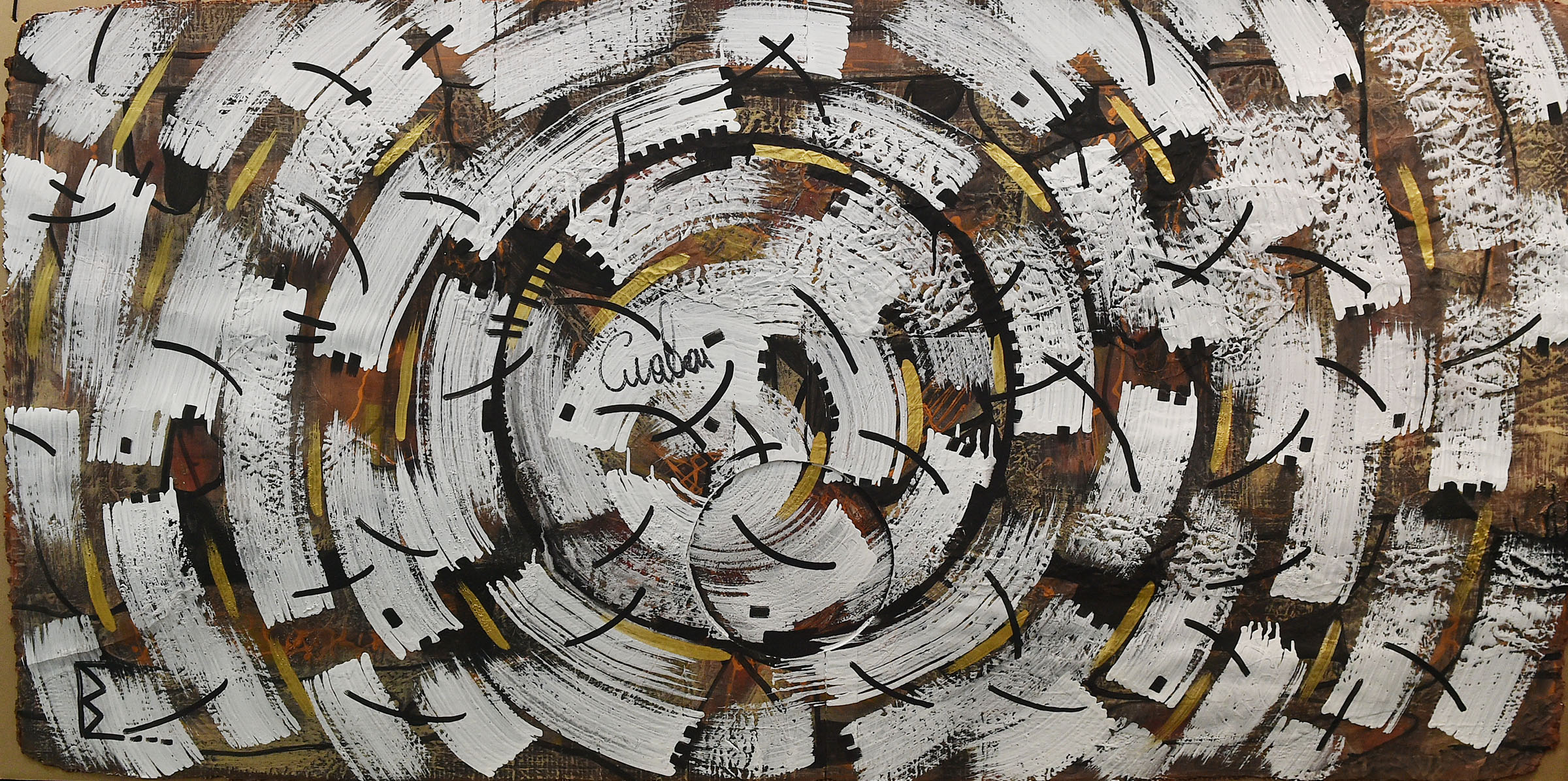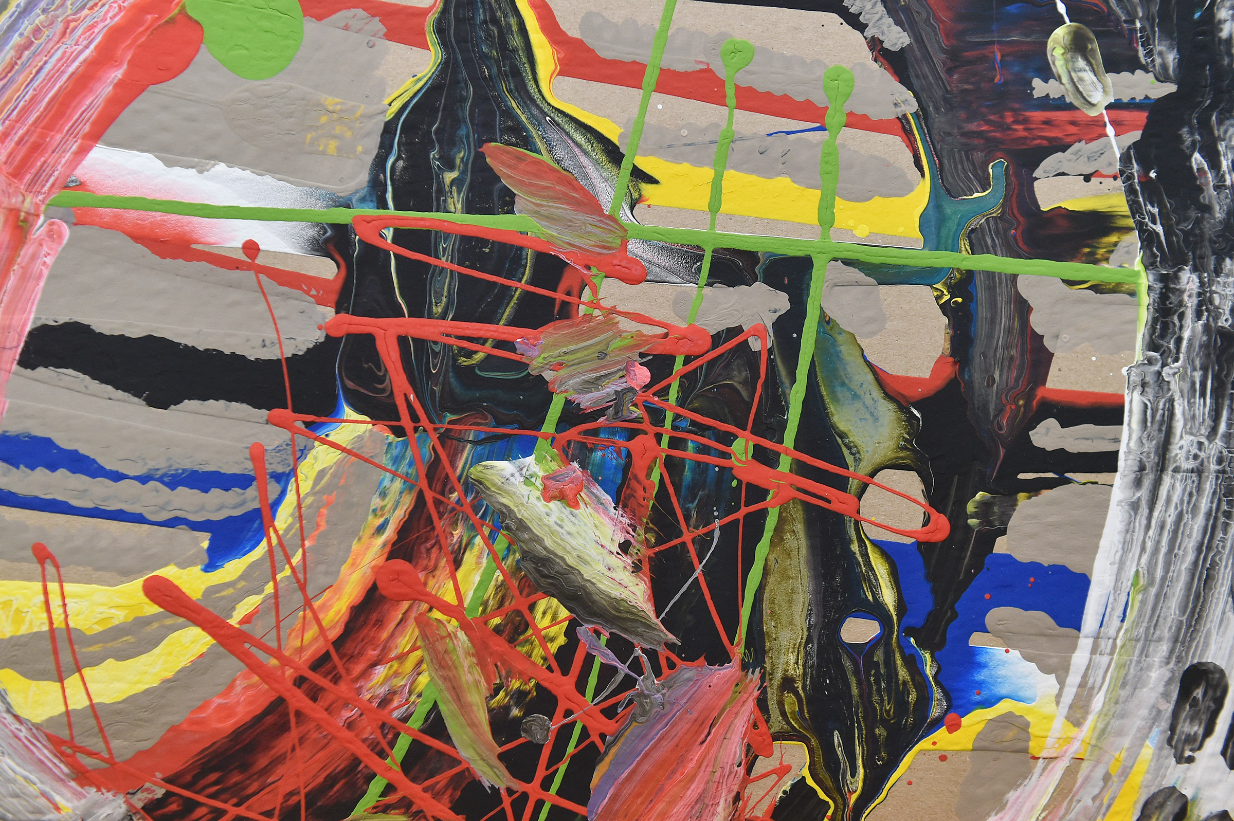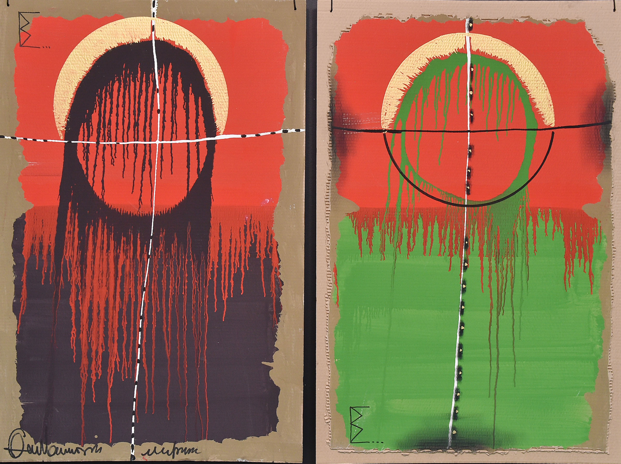 Впрочем, в применении к этому художнику жанровые определения страдают недостаточностью. В его абстракциях то и дело проглядывает фигуративность. Его круги превращаются то в огни светофоров, то в мишени, то в кометы, то в одуванчики, то в шаманские бубны, а то вдруг на зрителя из глубины картины выглядывает огненный глаз… В композициях возникают то пейзажи, то фигуры людей, животных, птиц. Где-то угадывается пёстрый петух, где-то — мчащийся конь, где-то — некто в погонах и наушниках — наверное, военный радист или курсант на отдыхе, слушающий музыку.