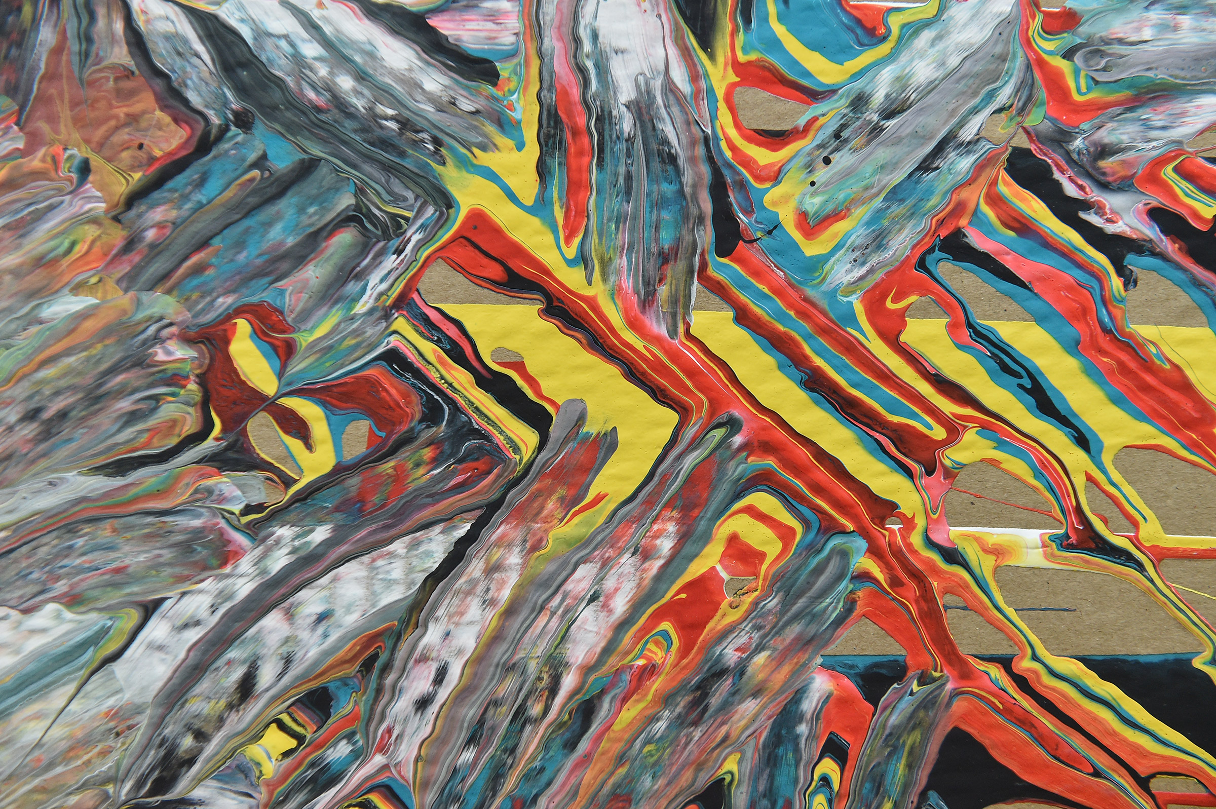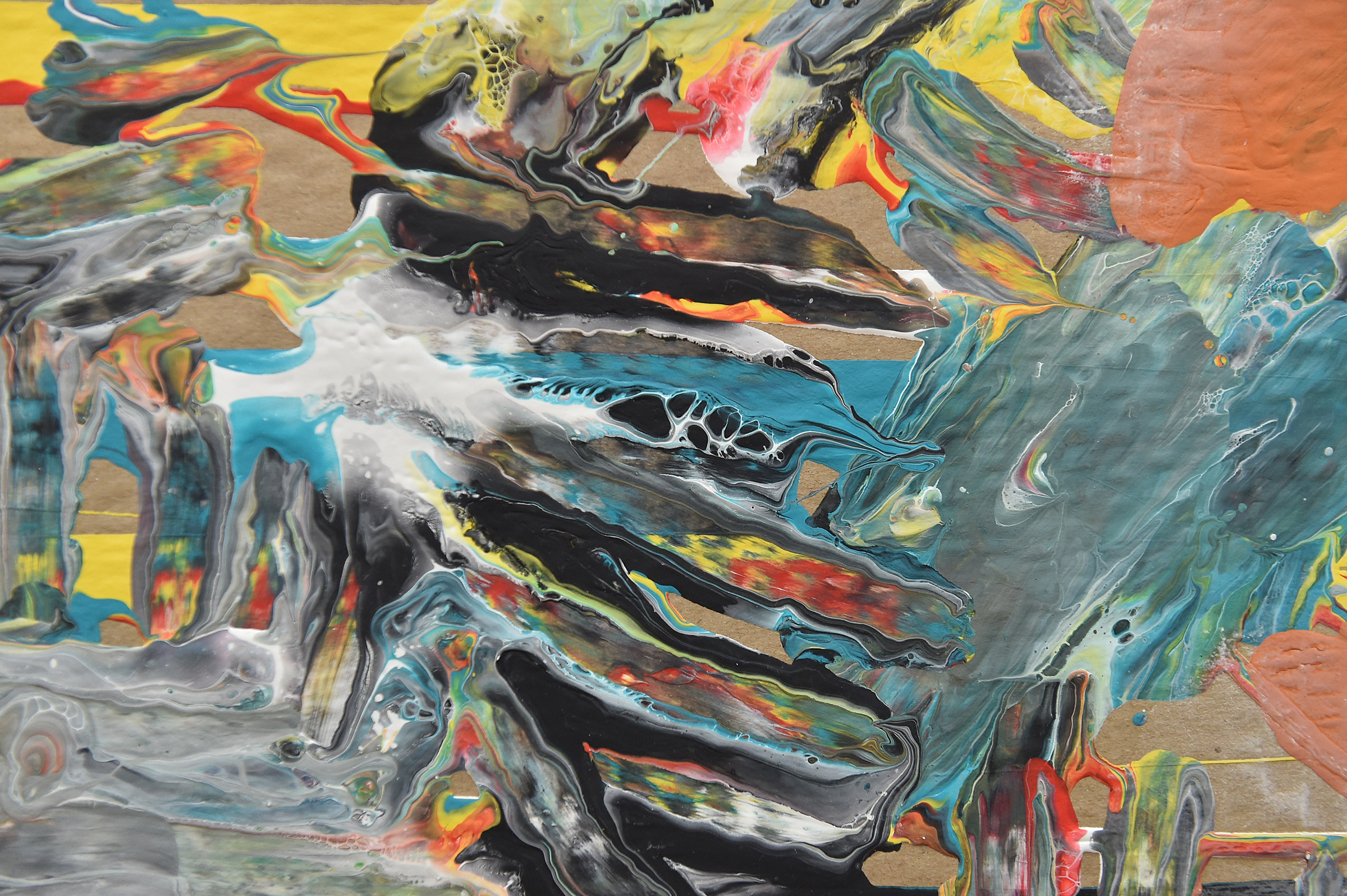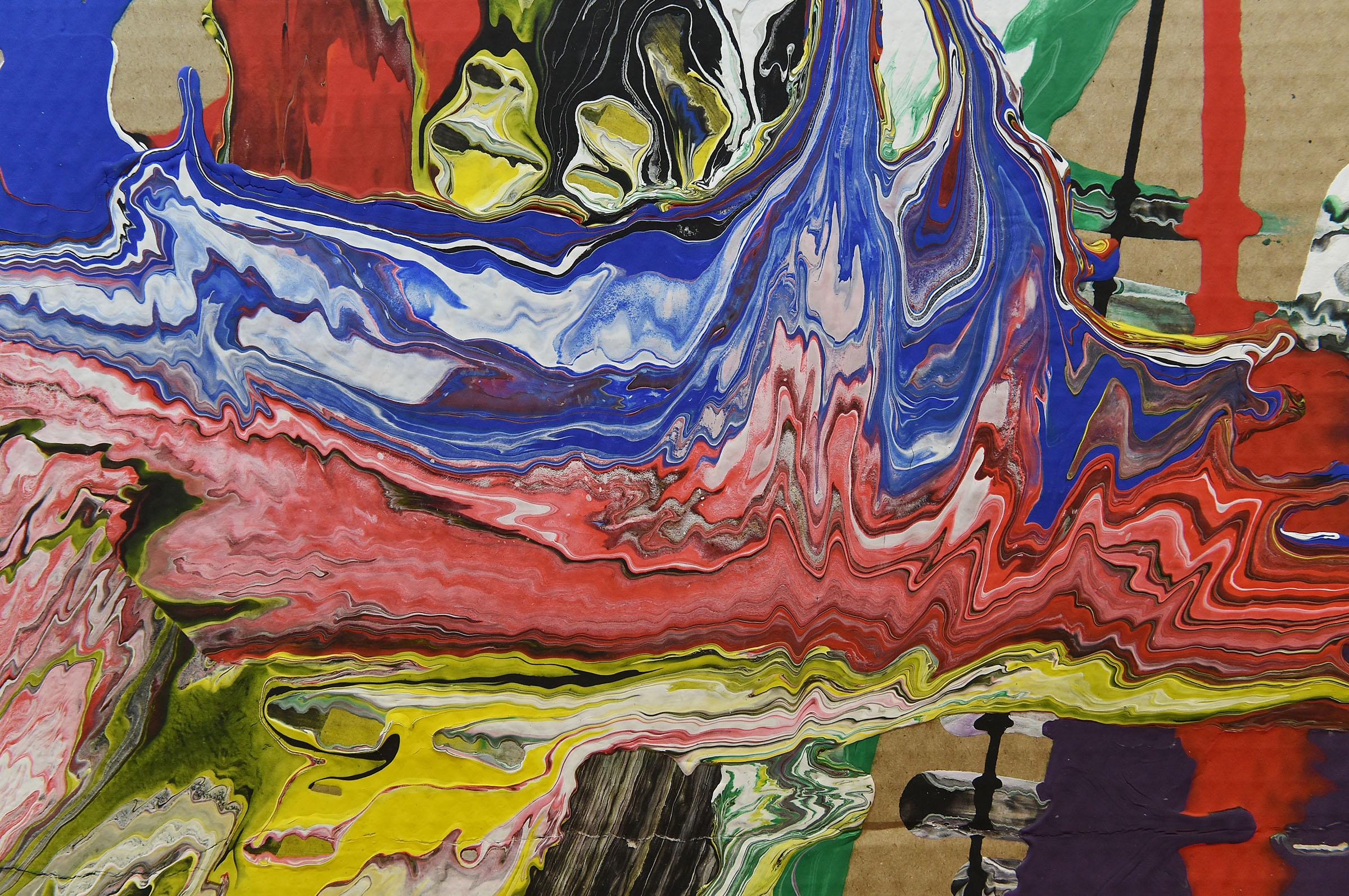 Все работы в «Магии круга» написаны акрилом по листам гофрокартона. Выбор материала создаёт особенную, очень непривычную эстетику: это и живопись, и бедное искусство в одно и то же время. Смирнов признаётся, что ему по душе «бедные» материалы — можно не бояться испортить, пишется легко, небрежно, а результат от этого только лучше.