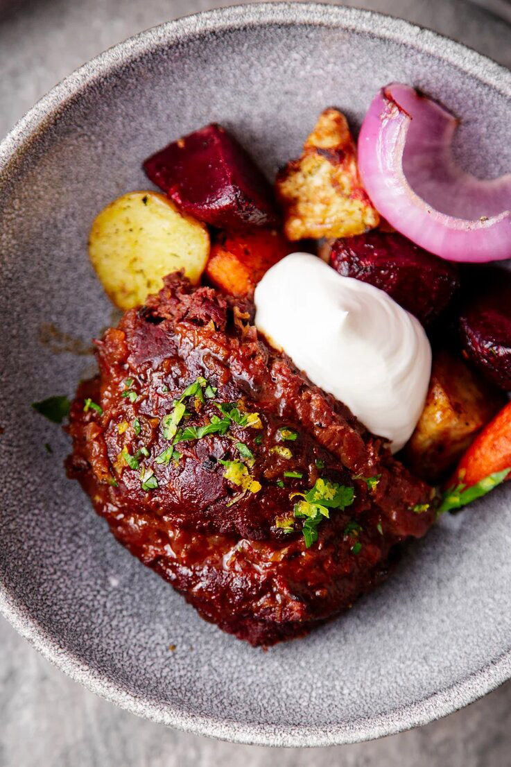 Но если серьёзнее — здесь есть где разгуляться. Разварная говядина, помимо огромного размера порции, претендует на звание лучшей в городе — и это не только моё мнение. Искусство не превратить мясо в тушёнку, но сделать его полноценно вкусным, казалось бы, утрачено — и снова вот. Вкусно очень. Говядина подаётся здесь с корнеплодами и «хитрым» кремом из сметаны.