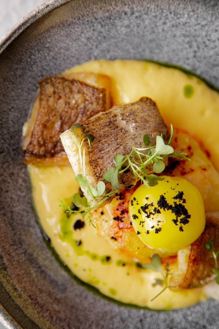 Отмечу, что здесь повар вообще любит делать большие порции из чего угодно. Огромнейшая порция голландского соуса скрывает аккуратный овощной гратен, на котором возлежит жареный палтус. Рыба лежит крайне недолго, исчезает быстро. Определённо качественное блюдо. Беспокоит только то, что в ресторане есть ещё не менее привлекательная чёрная треска, но три основных блюда слопать будет уже явным перебором.