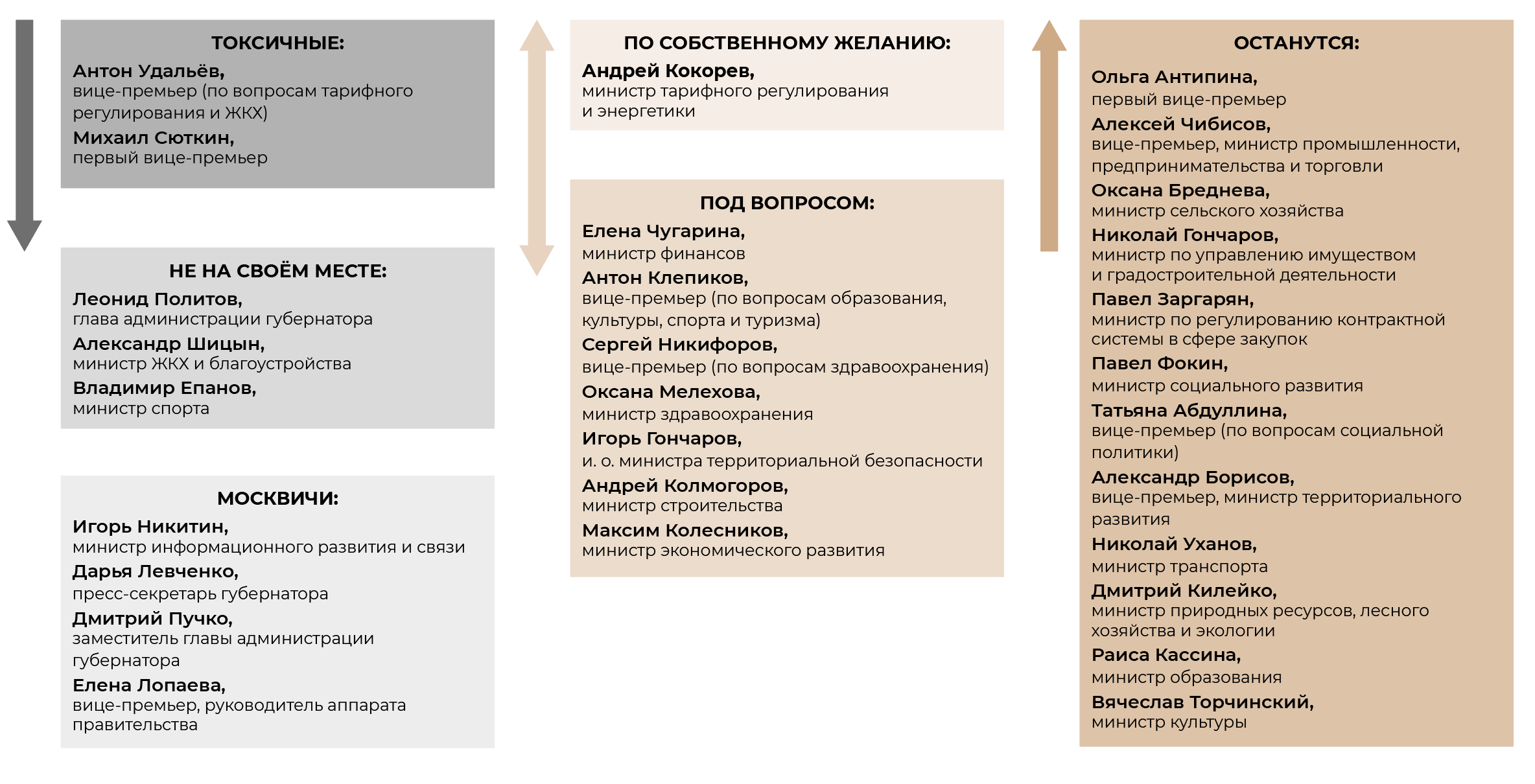 Пока кадровая логика Махонина состоит в том, чтобы, по выражению собеседника, «заводить людей параллельно». Советник и пресс-секретарь губернатора Дарья Левченко параллельно работает со Станиславом Шубиным, заместитель главы администрации губернатора Дмитрий Пучко и глава администрации Леонид Политов — с Александром Смертиным. Дело в том, говорят сразу несколько собеседников, что Пучко и Левченко — в ближнем круге экс-губернатора, и рано или поздно он заберёт их в Москву. И, скорее всего, это случится раньше сентябрьских выборов губернатора. «Дарье Решетников доверяет и ни с кем другим работать не сможет. Так же как и она не сможет работать ни с каким другим губернатором», — полагает собеседник. Да и Махонину в ближнем круге нужны люди, которым он сможет довериться.