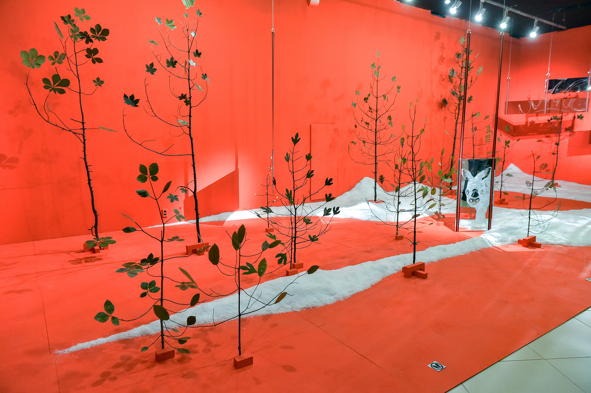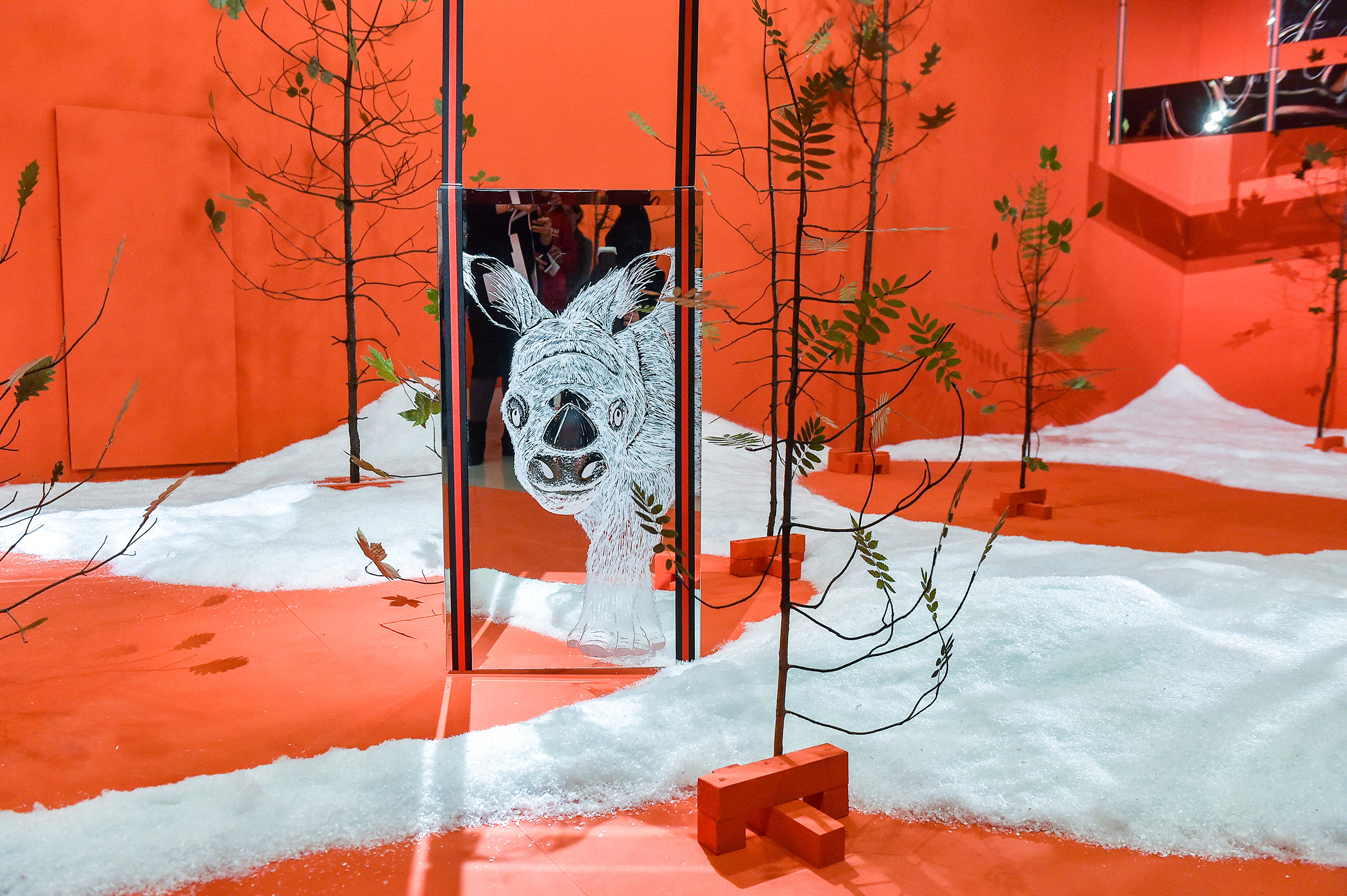 Вообще, Токе Люккеберг и его художники много внимания уделяют, так сказать, подкладке: посетители выставки вынуждены прогуливаться то по песку, то по искусственной травке, а то по соли, имитирующей снег. Последнее — часть инсталляции Расмуса Мюрупа «Плейстоценовая сцена». Художник выстроил в зале PERMM целый пейзаж эпохи плейстоцена (ледникового периода). Деревья, «снег»… И только животные присутствуют не во плоти, а, словно призраки, проступают белыми силуэтами из развешенных среди деревьев зеркал. Все эти олени, бизоны и шерстистые носороги были истреблены первобытным человеком, и, глядя в зеркала, нынешние представители homo sapiens видят себя в роли убийц этих животных. При этом инсталляция вовсе не страшная, не отталкивающая, а очень красивая.