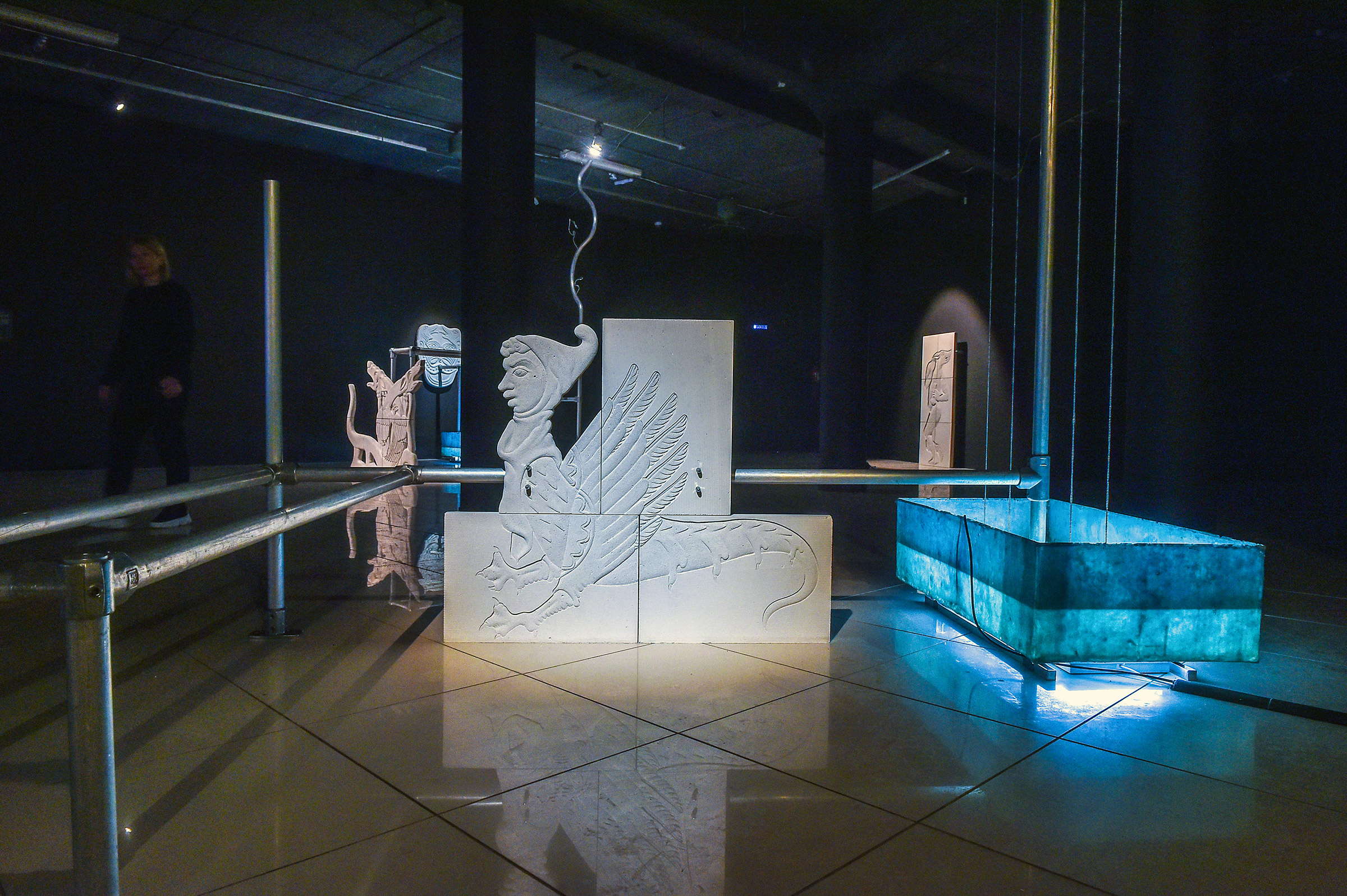 Взять хотя бы инсталляцию «Фонтан» датчанки Сиф Итоны Вестерберг, которая заняла почти всё пространство первого этажа. Красивые, белые, словно алебастровые (на самом деле — крашеный газобетон) скульптурные рельефы изображают причудливых химер; эти существа соединяют в себе антропоморфные и зооморфные элементы, смутно отсылающие к мифологиям разных народов: вот здесь голова европейского гнома, а вот тут что-то из ассирийских или хеттских изображений… И всё это красивейшим образом соединено с тонкими хромированными металлическими деревьями, словно мы попали в лес, растущий в мире роботов. Если белые химеры явно из прошлого, то «деревья», очевидно, из будущего. И сквозь всё это течёт вода (это ж фонтан!), вечная, вневременная, бесстрастная, живая и чистая.