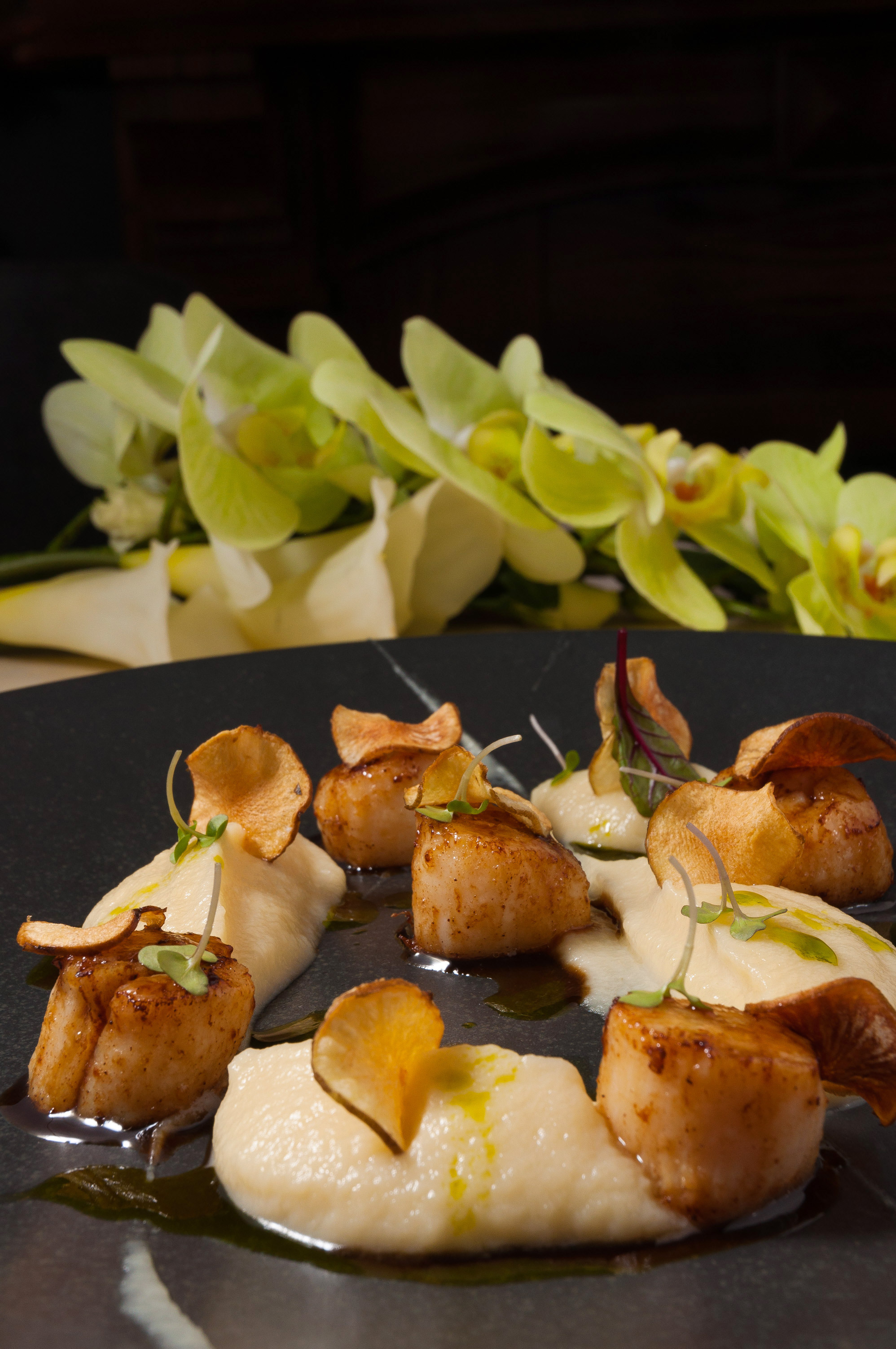 «Морской гребешок с топинамбуром» удивляет не только очень изысканным и приятным вкусом, но и количеством собственно гребешка. Это реально много. И реально вкусно… Ибо у столичных коллег принято положить посреди метровой тарелки два моллюска и травинку. Les Marсhes — не такой. Тут щедрые люди. Среди овощного пюре встречаются довольно пикантные и неожиданно уместные чипсы, масло и мелкая зелень.