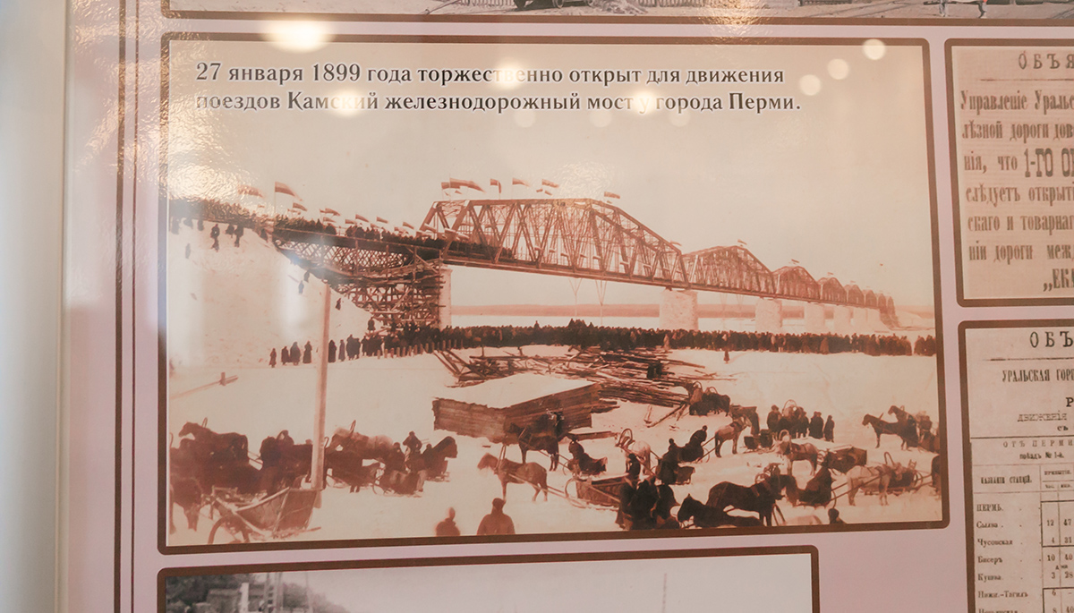Во всех подробностях экспозиция музея рассказывает о важнейшем этапе в развитии Пермской железной дороги — строительстве и открытии в 1899 году моста через Каму. Фотографии запечатлели, как строители выстроились под мостом, когда по нему прошёл первый состав, — гарантировали качество лично. Чуть позже в экспозиции — драматическая история о том, как во время Гражданской войны мост был взорван, а позже восстановлен.