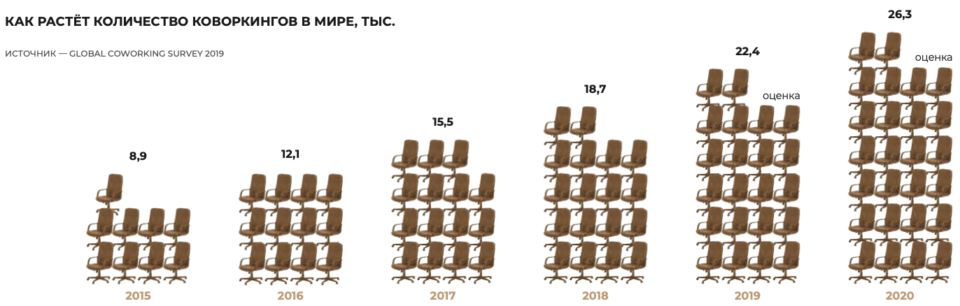 В любом случае участники рынка признают, что Пермь уступает большинству крупных российских городов по числу коворкингов. Эксперты видят в этом две основные причины — плохая раскрученность этого вида бизнеса (низкая информированность потенциальных клиентов) и психологическое отторжение такого формата работы. В целом в мире противоположная тенденция: за последние 10 лет количество коворкингов выросло более чем в 100 раз — с 160 в 2008 году до 18,7 тыс. в 2018-м (данные исследования Global Coworking Survey 2019).