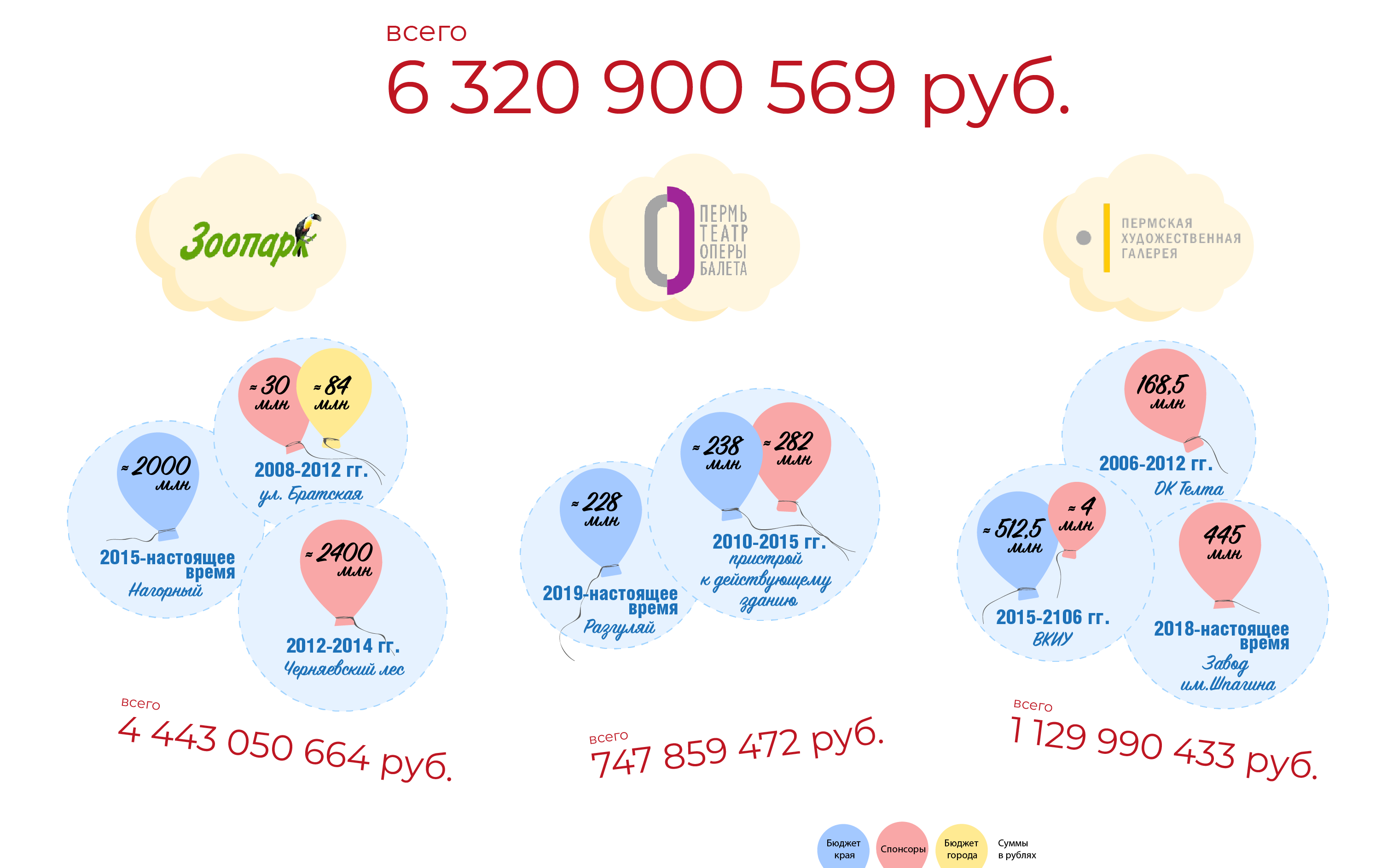 Впрочем, есть и хорошие новости. Почти половина из этих 6,3 млрд руб. — это не бюджетные деньги, а вложения спонсоров. Бюджеты Перми и края потратили 3,4 млрд руб. на три объекта, а спонсоры — 2,9 млрд руб. Другое дело, что по самым минимальным подсчётам (данные из открытых источников) 2,68 млрд руб. из 2,9 млрд руб. вложил фонд «Содействие. ХХI век», который считается близким к краевым властям. На счетах фонда аккумулируются добровольные пожертвования от крупнейших предприятий края.