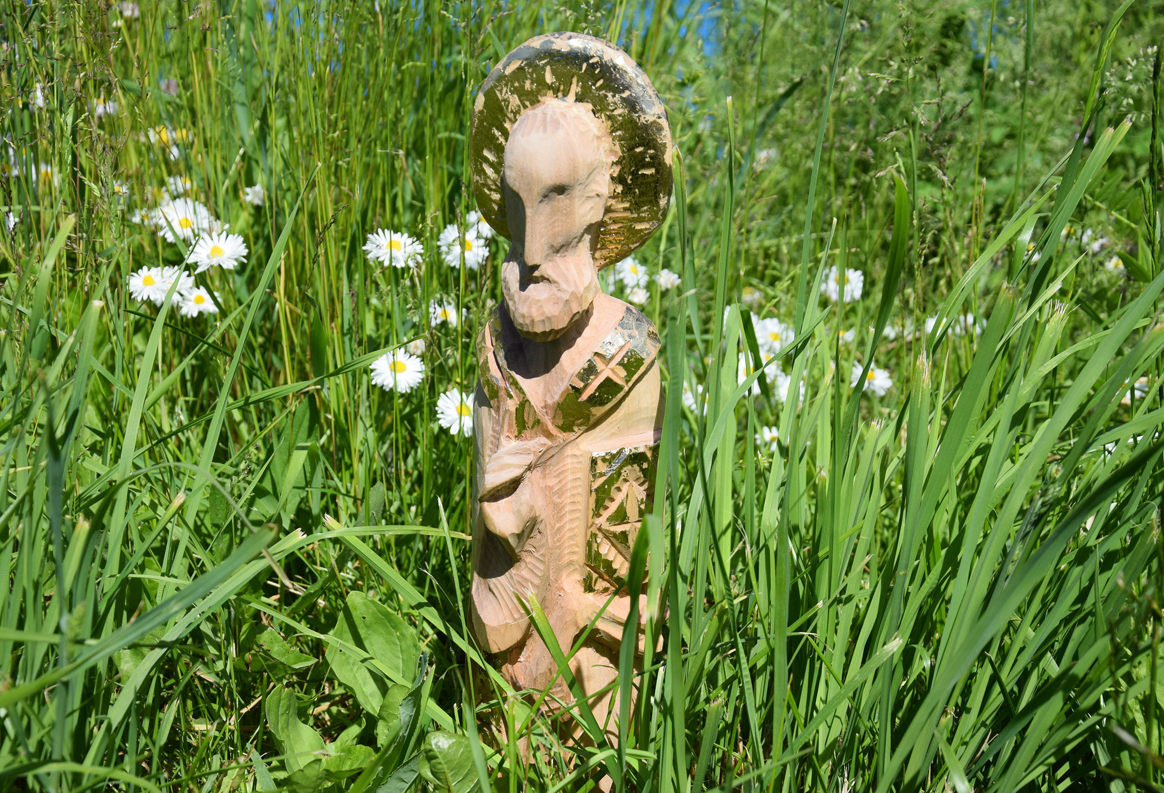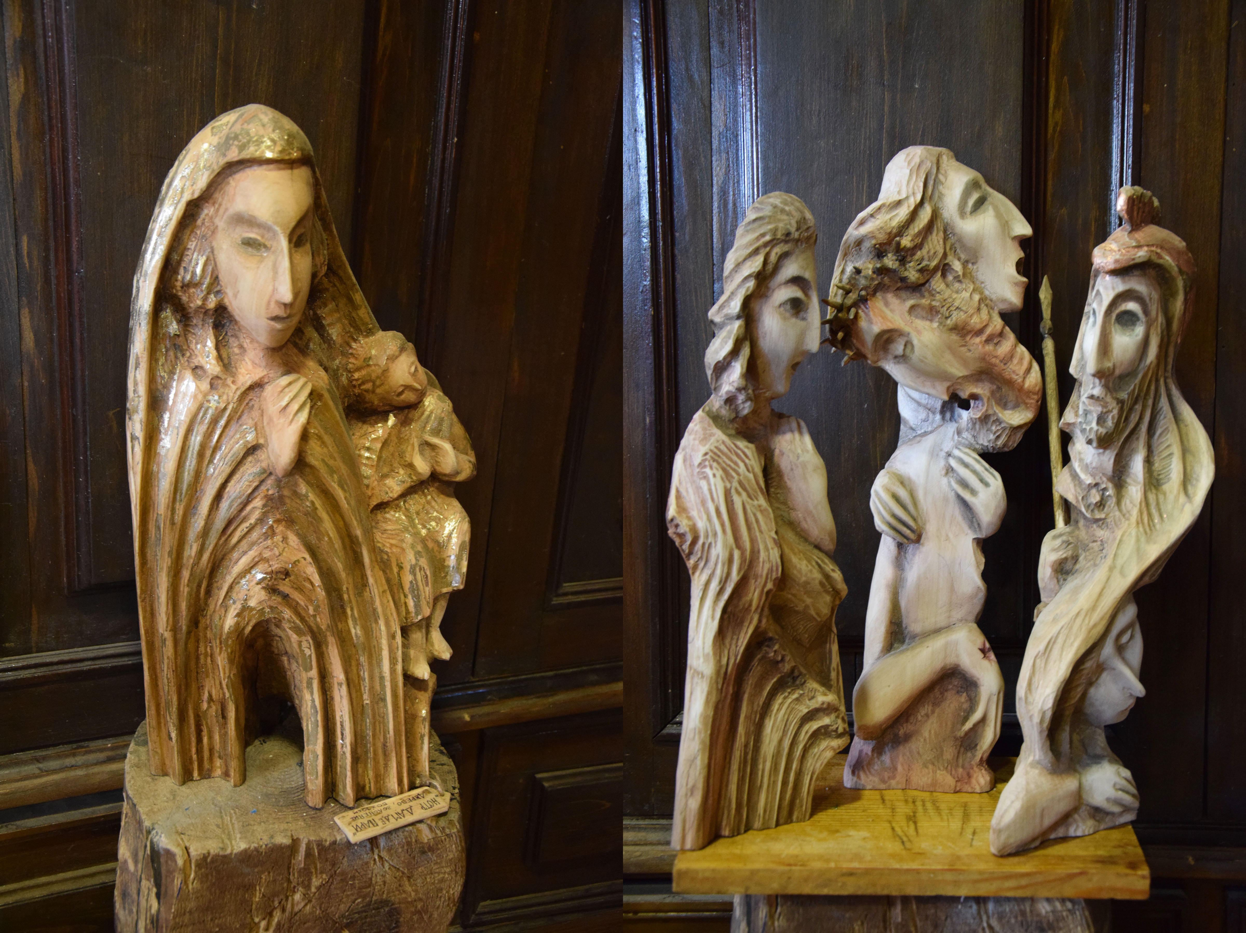 Среди скульптур, вырезанных Жарковым в Сюзьве, есть несколько Никол. Какие-то — абсолютно каноничные, строго по классической иконографии сделаны, другие — по характеристике самого художника, «постмодернистские», с серьёзными отступлениями от канона. Как именно резать скульптуру, а порой и что именно резать, подсказывает Жаркову дерево — его складки, прожилки и сучки. К фактуре дерева он максимально чуток: вот изображение Богородицы с младенцем, Юрий называет его «Нотр-Дам», потому что складки одеяния Марии падают, образуя подобие портала готического собора — так расположились слои древесины. А вот скульптура «Король Артур»: складки его плаща — это почти не обработанный древесный скол.